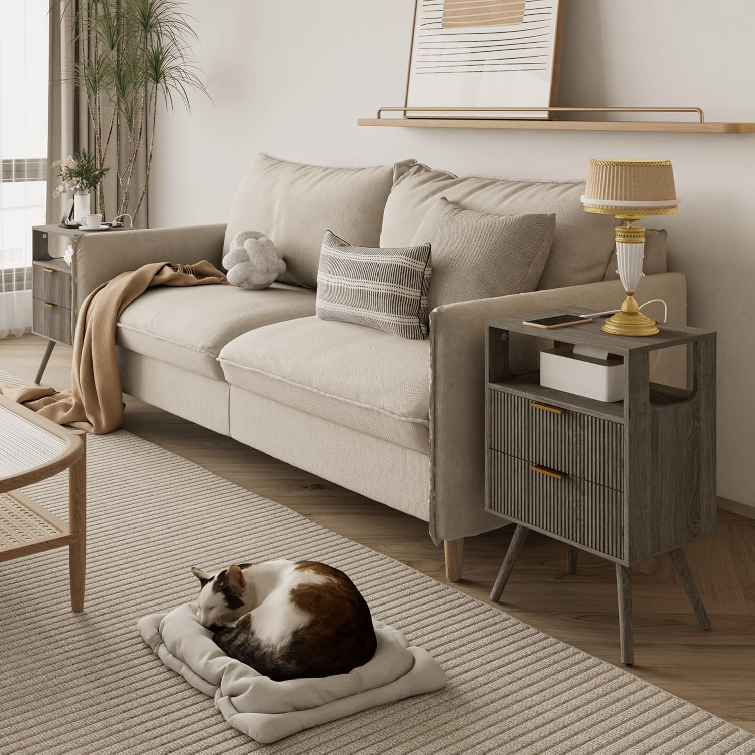Nightstand with Charging Station and LED Lights,Modern Bedside Table with 2 Storage Drawer and Open Wood Shelf, for Bedroom and Small Spaces,Night Stand with Solid Wood Legs,GreyOak