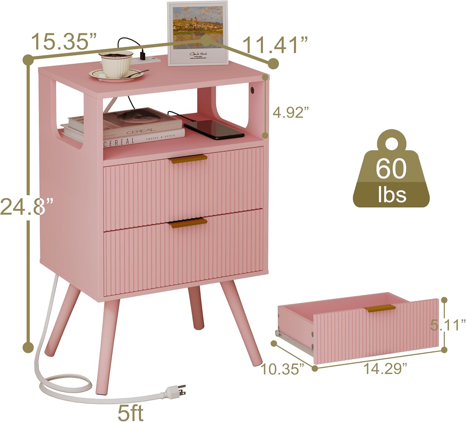Pink Nightstand with Charging Station and LED Lights,Modern Bedside Table with 2 Storage Drawer and Open Wood Shelf, for Bedroom and Small Spaces,Night Stand with Solid Wood Legs,Pink