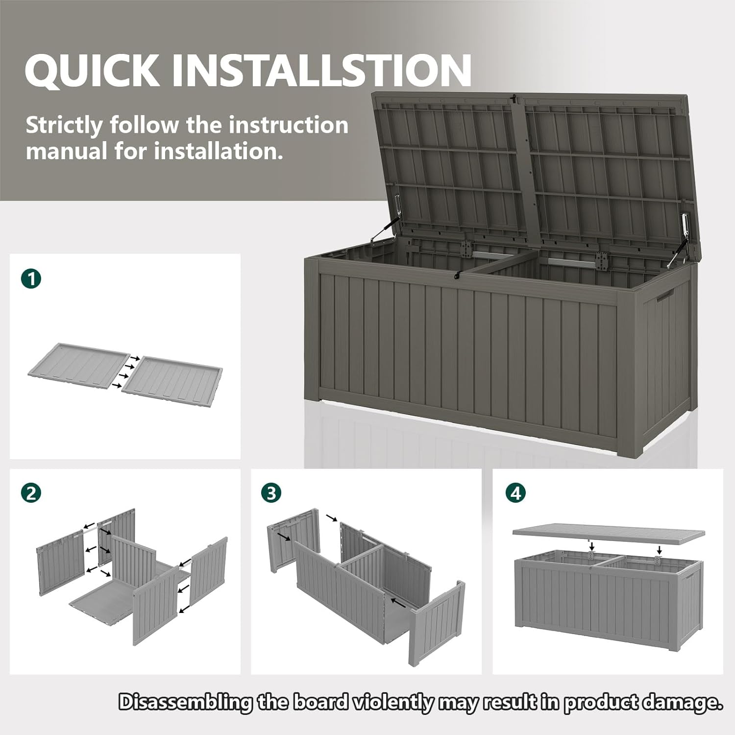 • EASY TO ASSEMBLE - Setting up this deck box is a breeze. Simply follow the provided instructions, connect the six side panels through the clasp, and you'll have a fully assembled box within just 30 minutes. Enjoy quick and hassle-free installation without the need for additional tools.