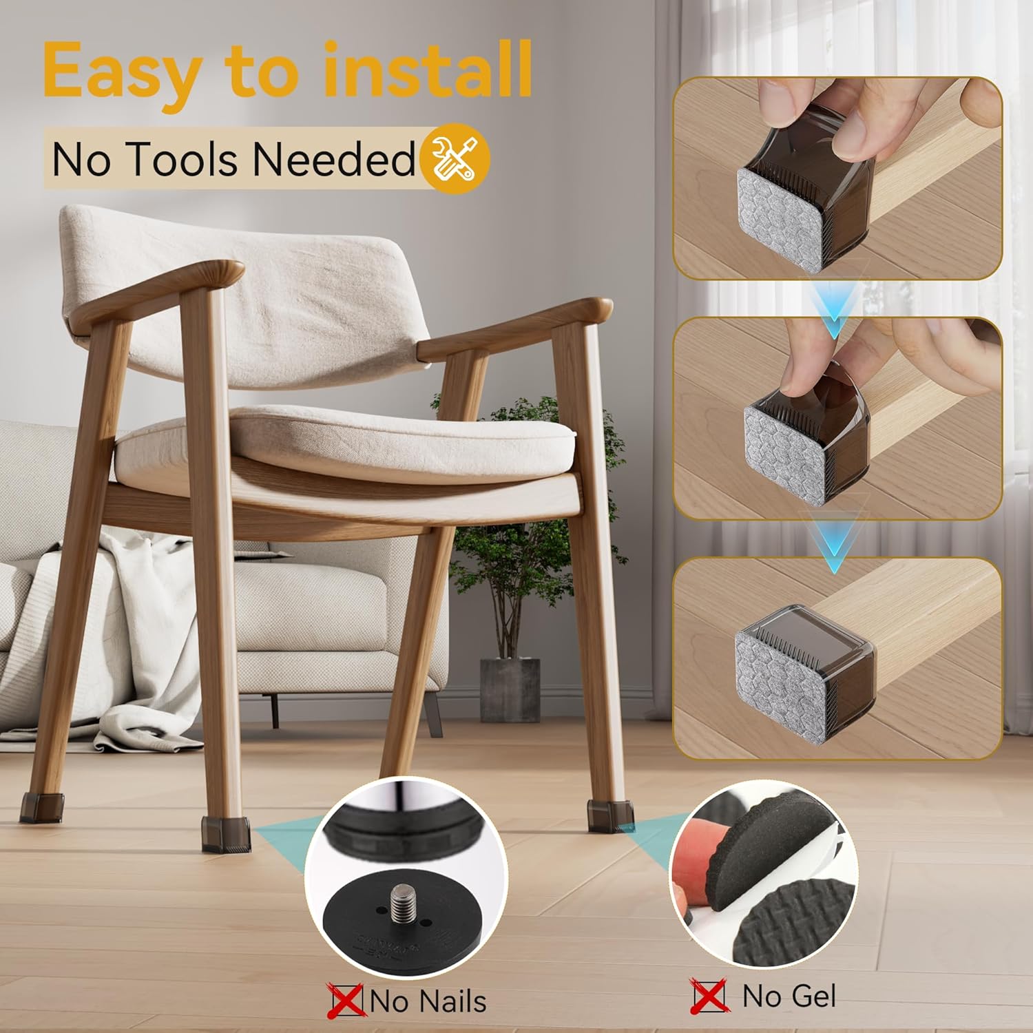 • ✅【Easy to Use】The furniture leg protectors are easy to install, without the use of tools. You just need to slip the chair leg protectors for hardwood floors over the bottoms of the chair legs. Easy to put on and take off. Much better than the felt or ones that have to be nailed on! Mainly suitable for smooth floors such as hardwood, tile, composite floor, and vinyl floor. Cap style match with most floors.