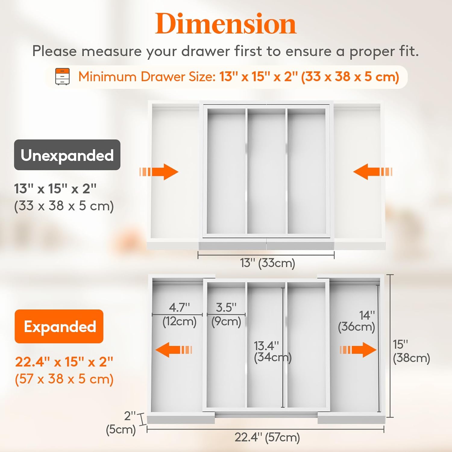 • Expandable Design: Expandable from 3 to 5 slots, measures 13" x 15" x 2" (33 x 38 x 5 cm) when folded and expands to 22.4" x 15" x 2" (57 x 38 x 5 cm); fitting drawers 13'' to 22.4''(33-57 cm) wide