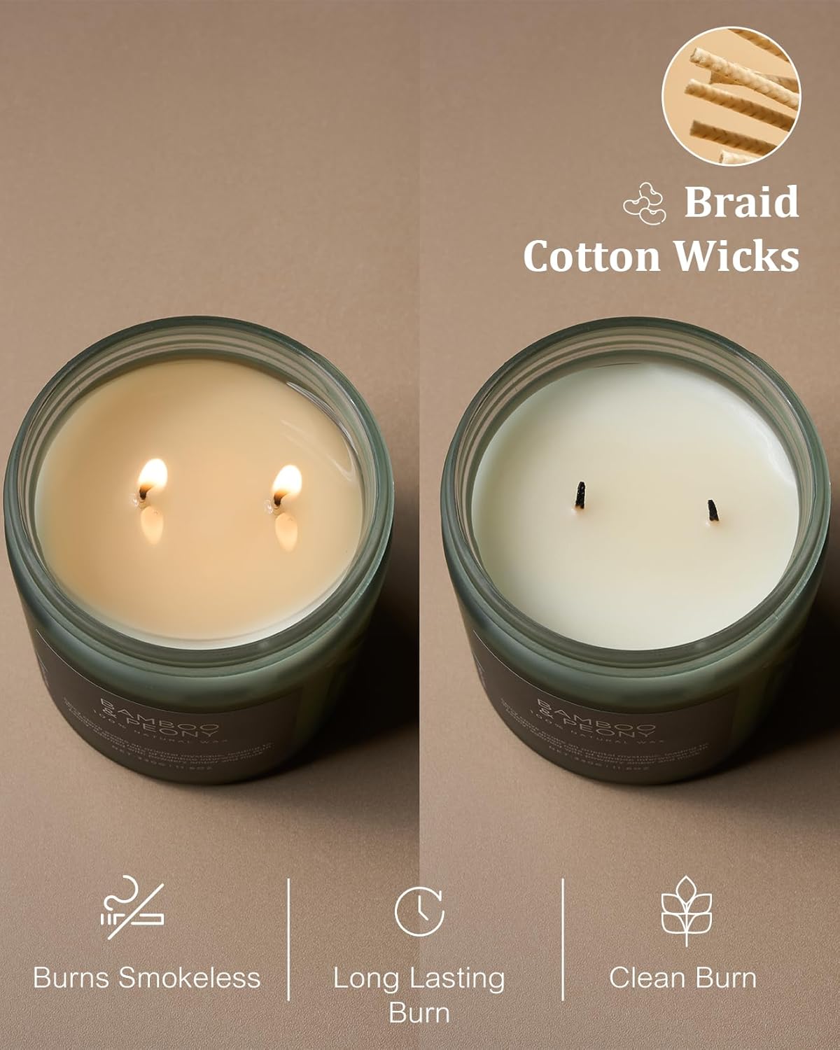 • Clean Consistent & Even Burn - Using 2 American made lead-free cotton wicks for a even burn result. They're cotton flat braid wicks with paper throughout, providing increased rigidity and burn more consistently than 100% cotton wicks. Designed to reduce carbon buildup which leads to black soot.