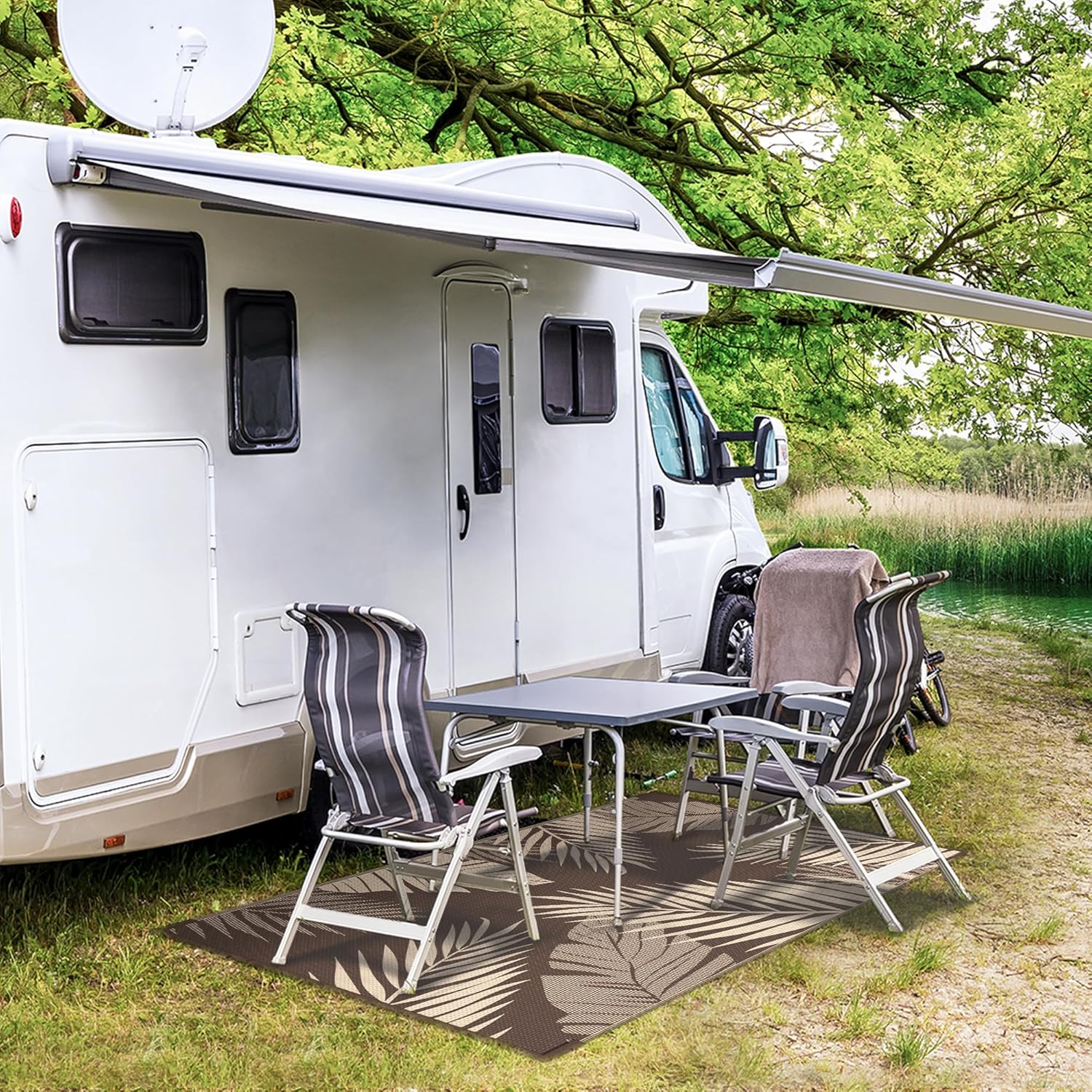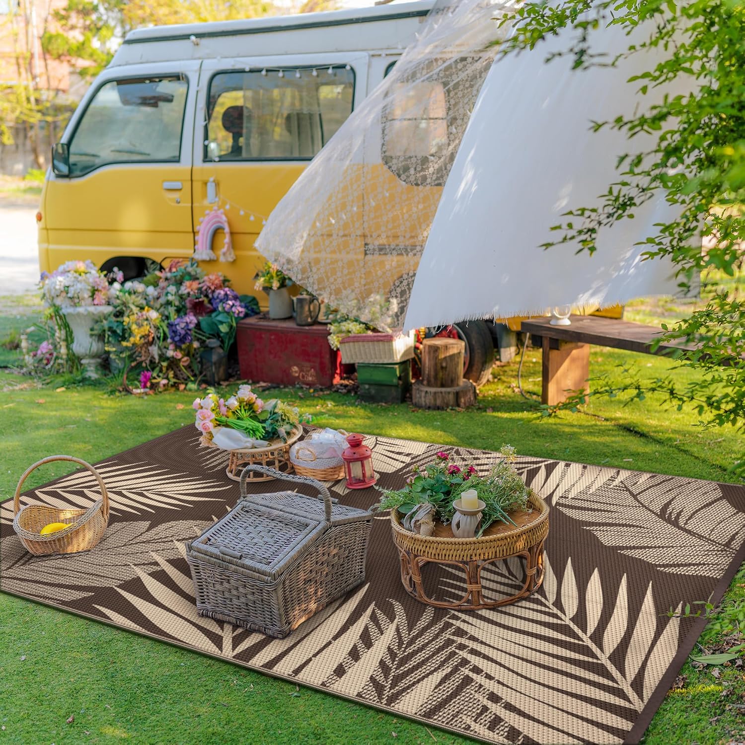 • Perfect Choice For RV Camping: Woven from lightweight plastic straws, these RV outdoor rugs fold compactly to fit in the included carry bag. This portable waterproof outdoor rug is easy to carry, with 4 corner loops and stakes to secure it. Using this camper rug reduces travel fatigue and adds plenty of space for fun — also a stylish touch for fall decor when setting up your campsite
