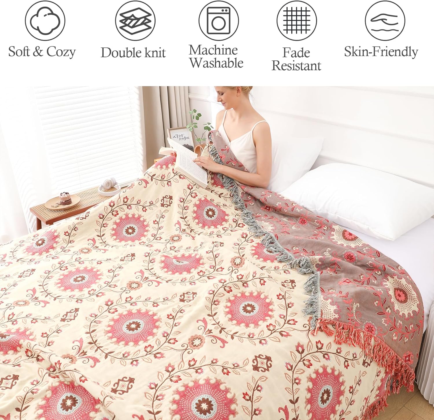 Snycler Boho Throw Blanket for Bed - 100% Cotton Ultra Soft Rustic Quilt - Pink Boho Floral Printed Farmhouse Decor Bed Blankets, 80"×90" All Season Rustic Throw for Sofa Couch Chair
