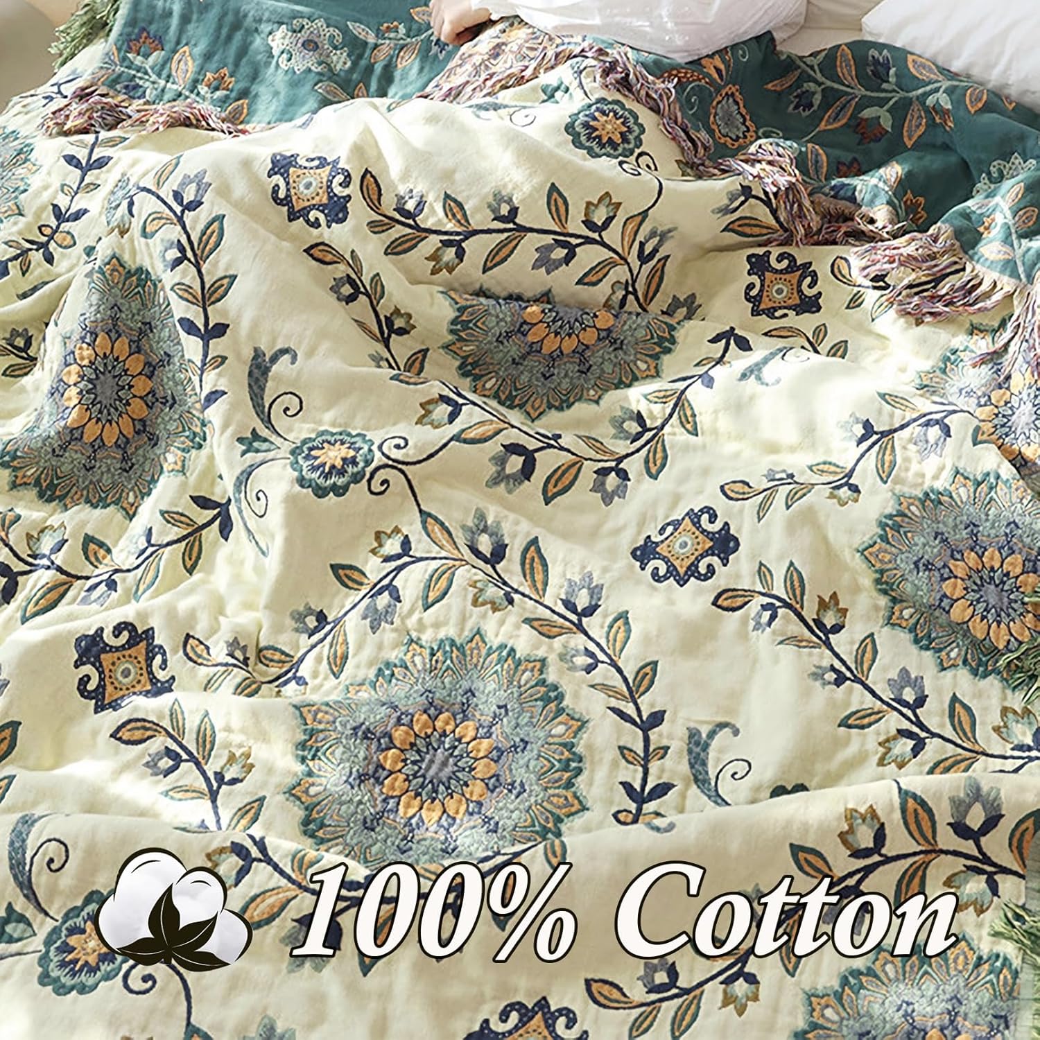 Snycler Boho Throw Blanket for Bed - 100% Cotton Ultra Soft Rustic Quilt - Blue Green Floral Printed Farmhouse Decor Bed Blankets, 60"×80" All Season Rustic Throw for Sofa Couch Chair