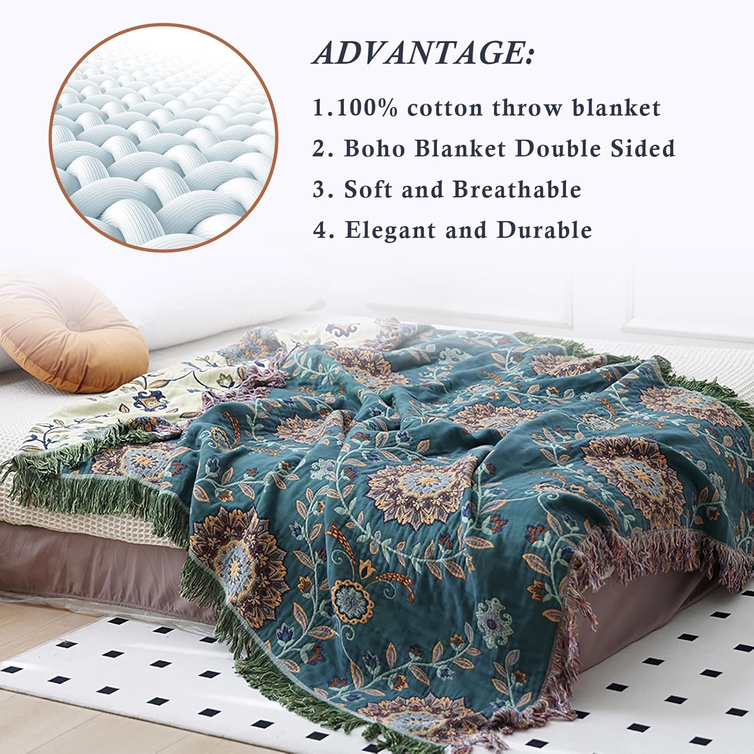 • UNIQUE DESIGN: This bohemian farmhouse blanket has a very chic, vintage look. Our bohemian bed blanket features a beautiful animal or floral geometric pattern on both the front and back and combines elements and vibrant colors.