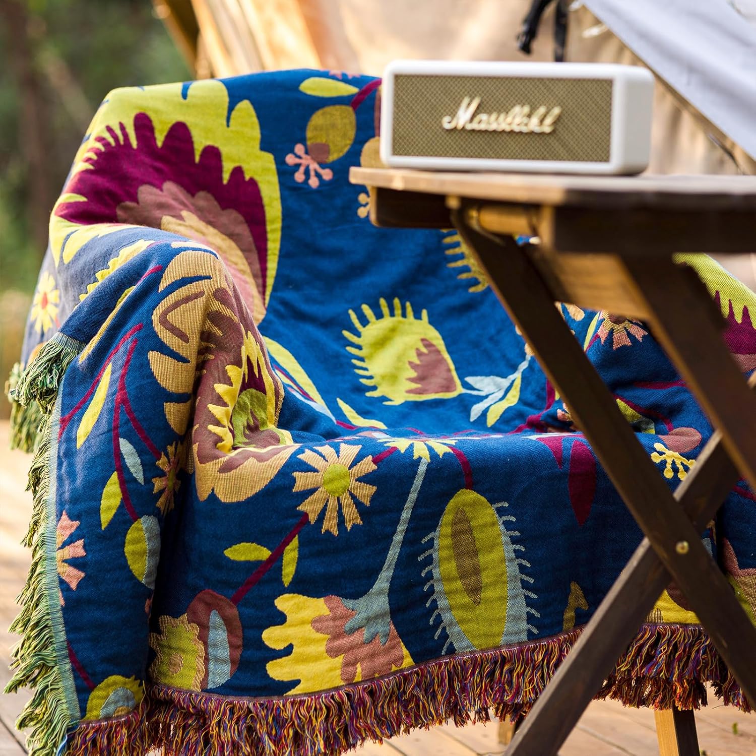 Snycler Boho Throw Blanket for Bed, 100% Organic Cotton Muslin Soft Throw-Blue Boho Floral Farmhouse Rustic Spring Summer Fall Decor Blanket for Couch Sofa Quilt and Gift, 80" x 90"