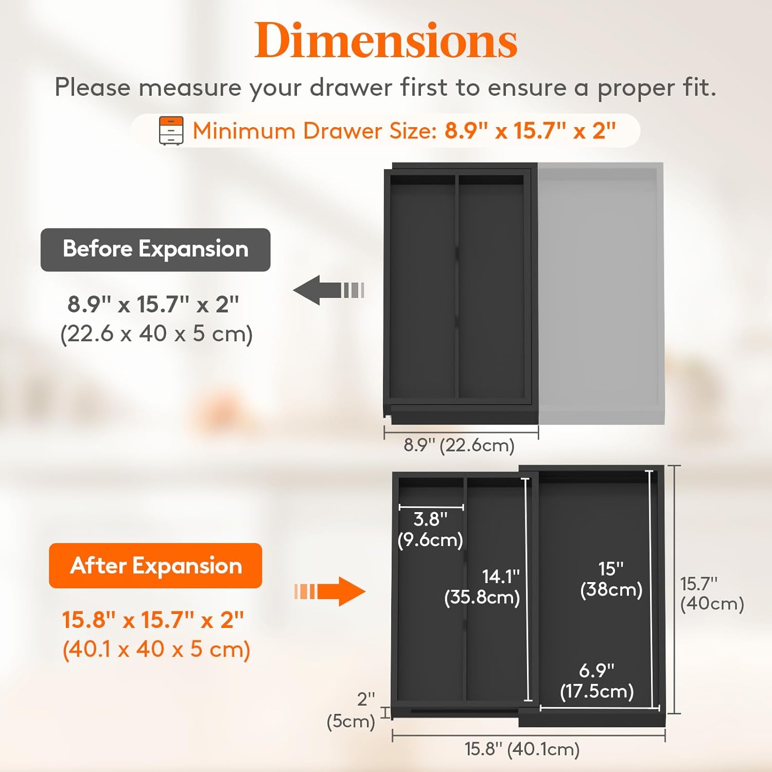 • Expandable Design: This utensil drawer organizer can expand from two compartments to three and measures 15.8 x 15.7 x 2 inches after expansion, providing extra storage space. With an adjustable width range of 8.9-15.8 inches it ensures a perfect fit for most drawers
