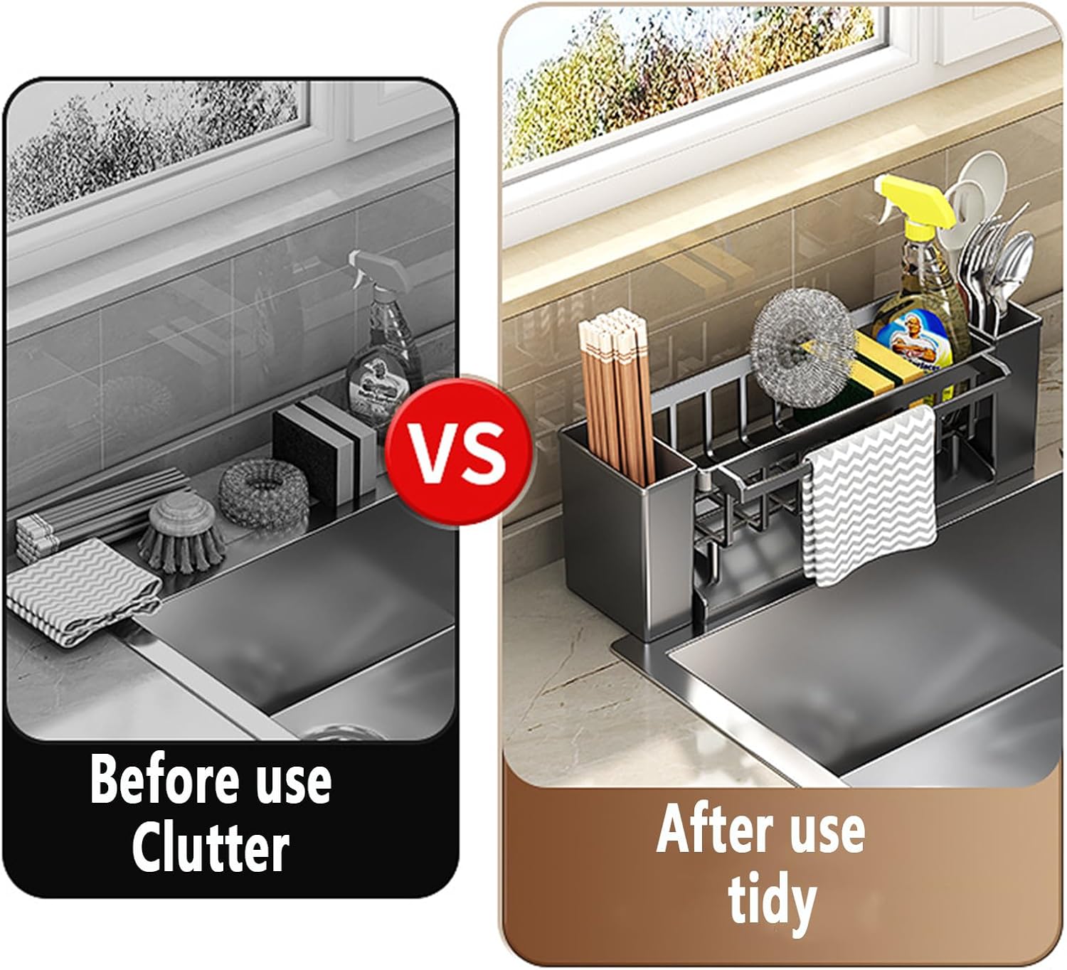 • Perfect Self-Draining Tray Design:This kitchen sink caddy features a self draining tray design that quickly drains water into the sink, helping your cleaning tools dry faster and stay clean.