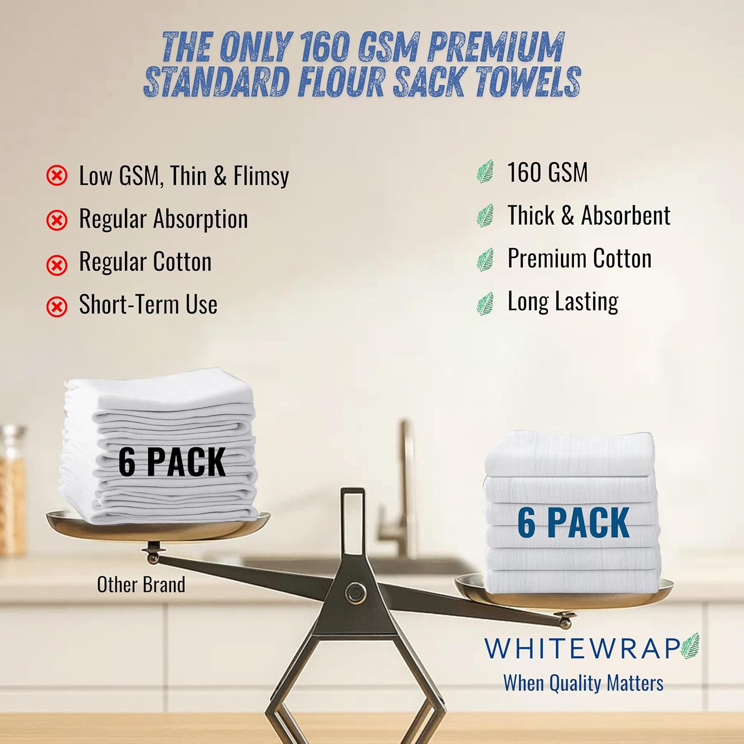 • ✅ Ultra-Thick 160 GSM Flour Sack Towels – Kitchen-Grade Absorbency Tired of thin, ineffective towels? WHITEWRAP’s high-density 160 GSM flour sack towels, made from 100% ring-spun cotton with a 130 thread count, offer exceptional thickness and ideal for drying dishes, wiping, and tough kitchen tasks.