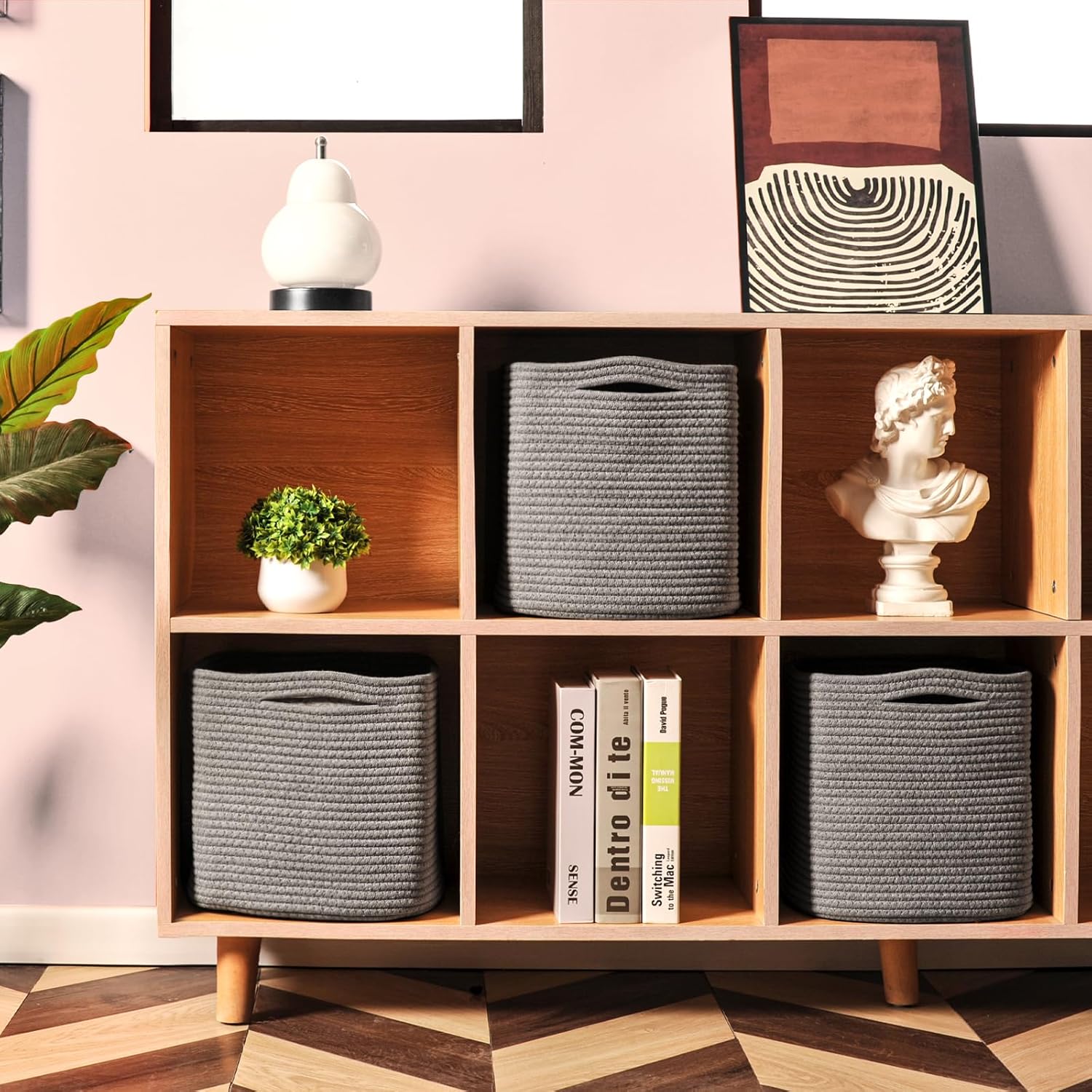 • Natural Cotton Rope Baskets for Storage: Our 11x11 cube storage bins are all made of natural cotton. These grey storage baskets for shelves are soft, durable, foldable and safe for children and pets. Using our woven baskets for storage to organise and store your home will give you peace of mind