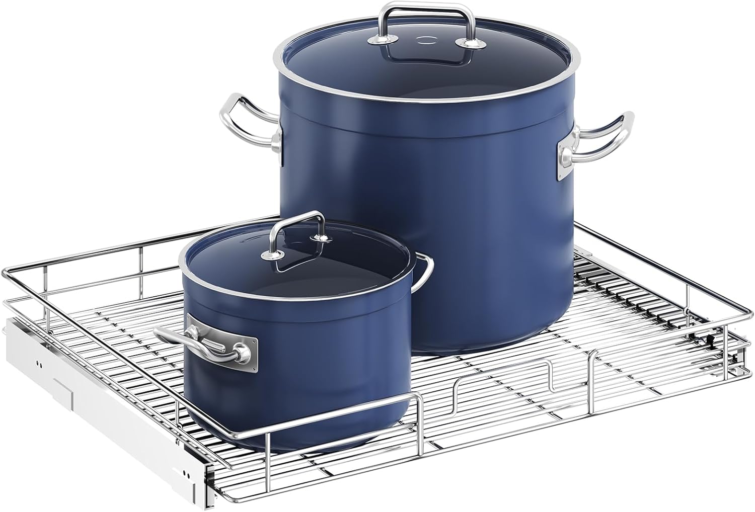 • 【Space-saving Pull Out Cabinet Organizer】This slide out cabinet organizer can maximize your cabinet space. Makes it super easy to store, organize, and access your stand mixers, pots, pans, baking sheets and other kitchen accessories, cleaning supplies, and various odds and ends. Now your cabinet is no longer just stacks of pots pans. You can contact seller via Amazon Messages to make sure if the size fit your cabinet.