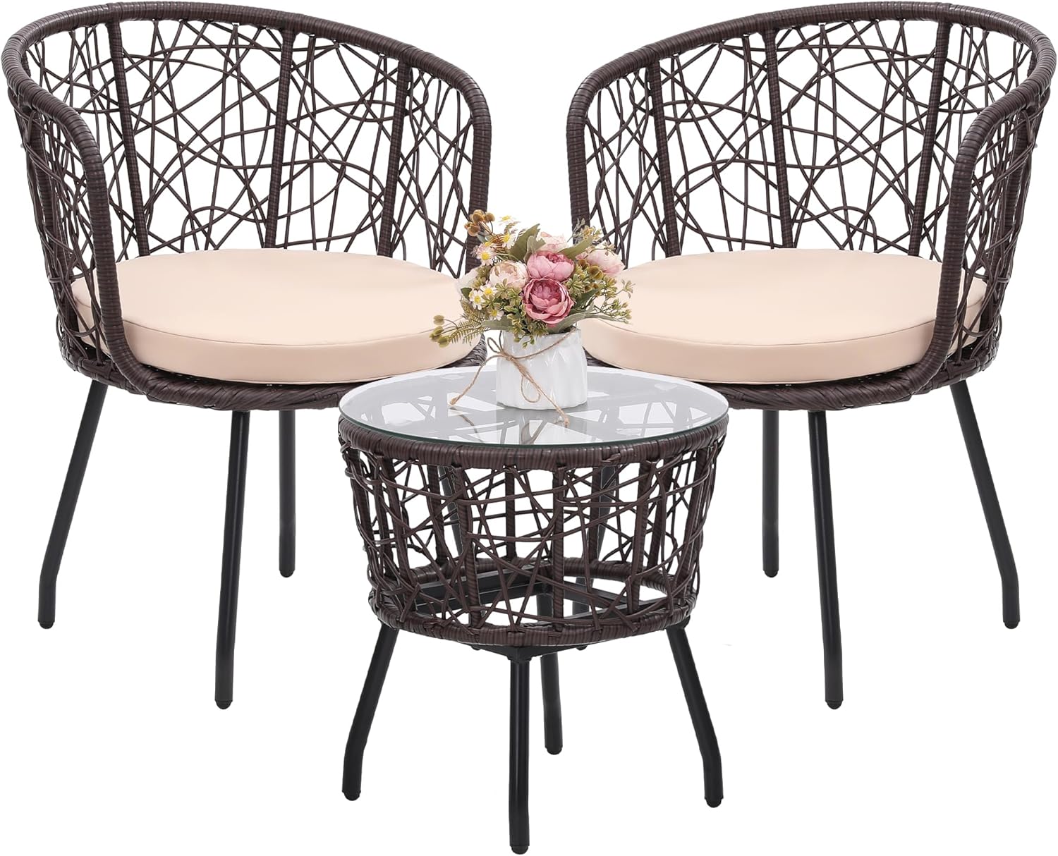 Kromax 3 Piece Bistro Set, Modern Outdoor Wicker Patio Furniture with Tempered Glass Table Top and 2 Chairs, Washable Cushions, Brown Rattan and Begie Cushion