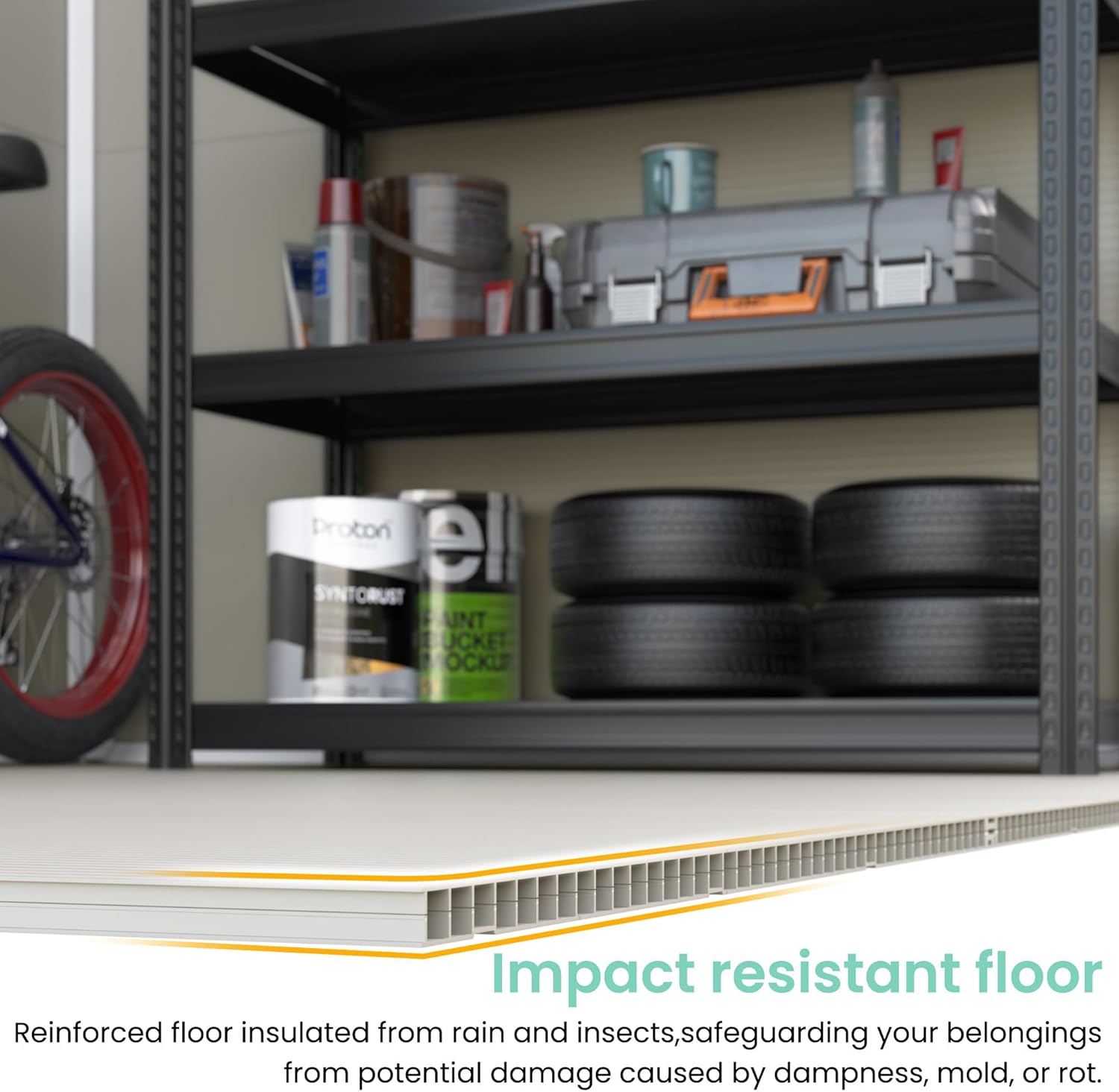 • RECYCLABLE RESIN MATERIAL: Our storage shed is crafted with 12 MM premium polypropylene resin plastic, which is recyclable. Resin shed is corrosion-resistant, waterproof, rustproof and with UV protection for more than 8000 hours, less bending and puncturing, worry-free for use in all weather conditions. It can be used daily for five years without fading