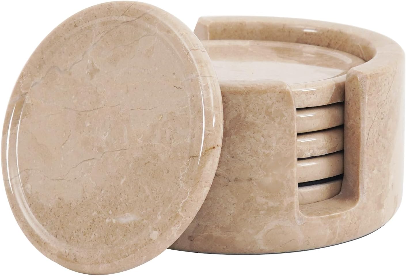 • Set of 6 with Holder Included - Includes 6 round stone coasters with a matching holder for easy storage and display.