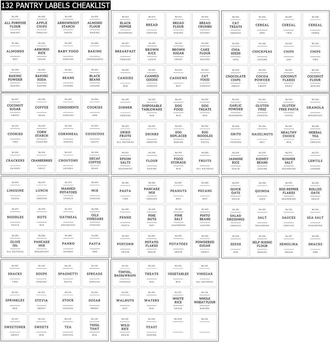 • 【PERFECT FOR PANTRY】132 Kitchen pantry labels for containers to keep your food fresh and pantry tidy. Minimalist labels are black text on white food labels stickers suitable for all airtight storage containers. Pantry decal organization labels are preprinted on premium waterproof vinyl stickers that won't tear or peel off but can easily be removed.