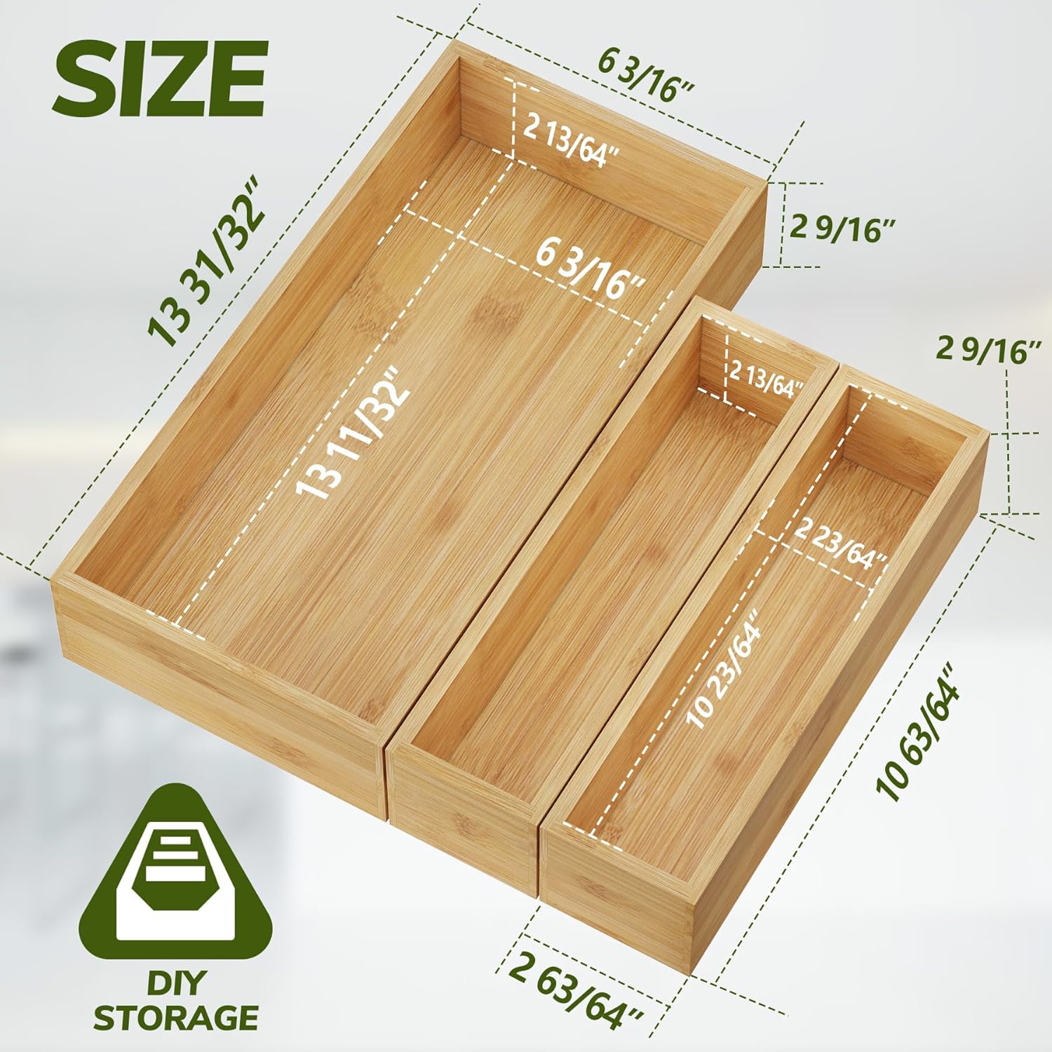 BAMEOS 3-Piece Bamboo Drawer Organizer, Utensil Organizer for Drawer, Junk Drawer Organizer for Kitchen Bathroom, Dressing Room, Office, Pantry (Natural)