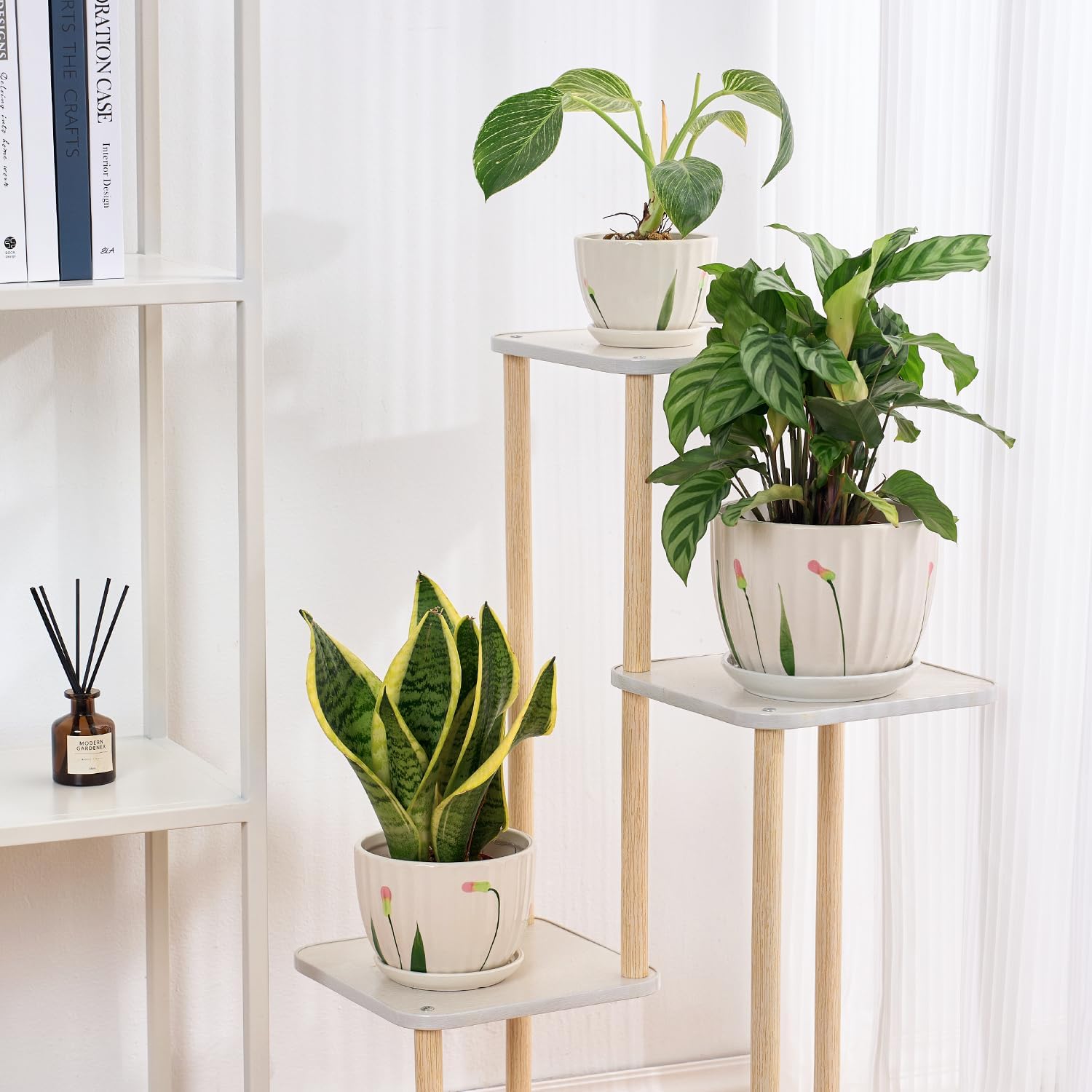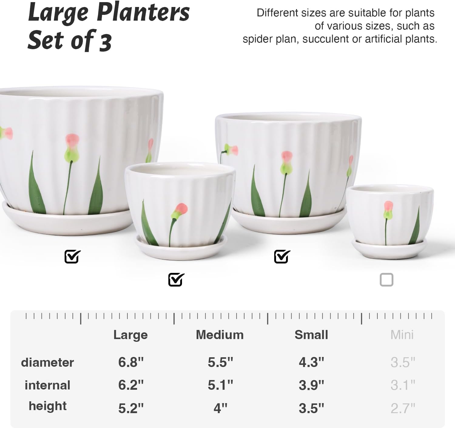 4/5/6 Inches Ceramic Plant Pots with Drainage Holes and Saucers, Round Flower Pots for Indoor Plant, Small Flower Planters Set of 3 (White Floral-Big Size)