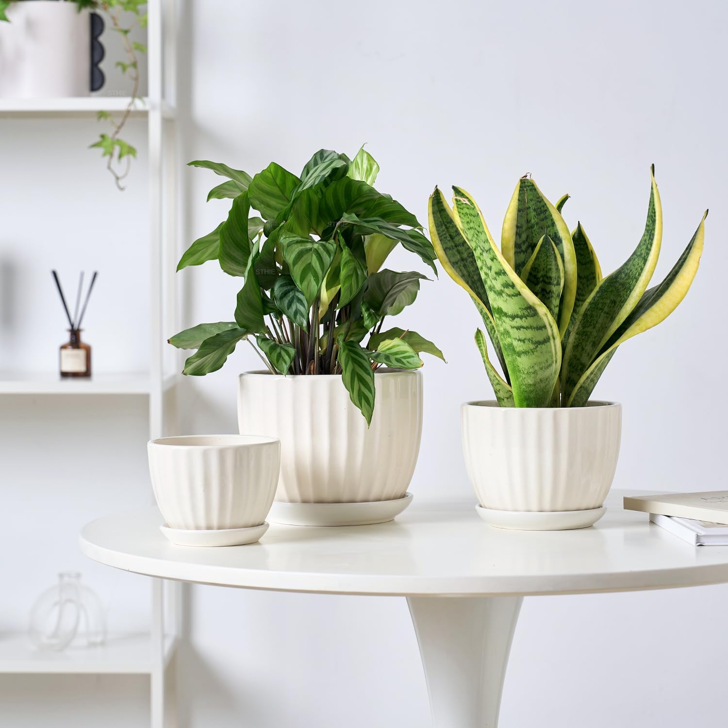 4/5/6 Inches Ceramic Plant Pots with Drainage Holes and Saucers, Round Flower Pots for Indoor Plant, Modern Flower Planters Set of 3 (White-Big Size)