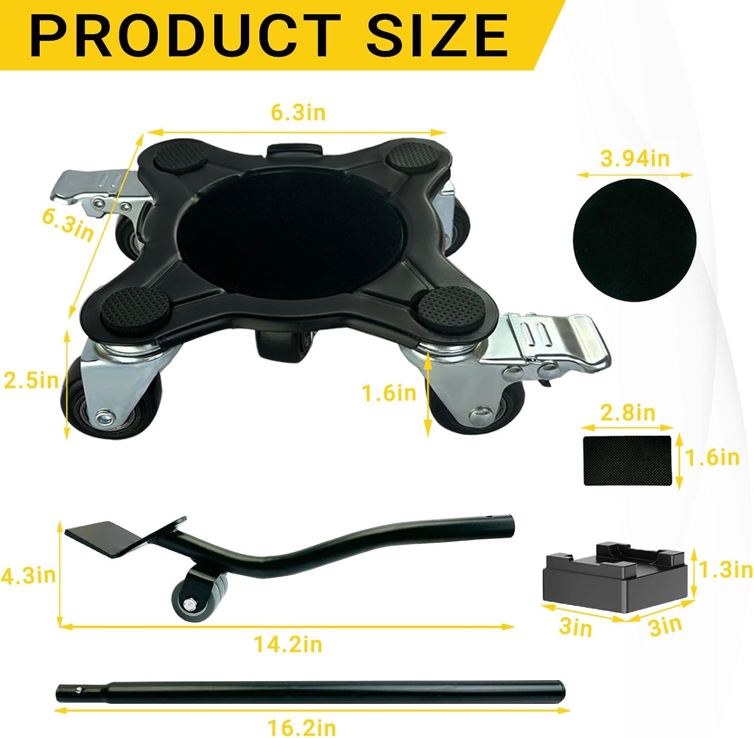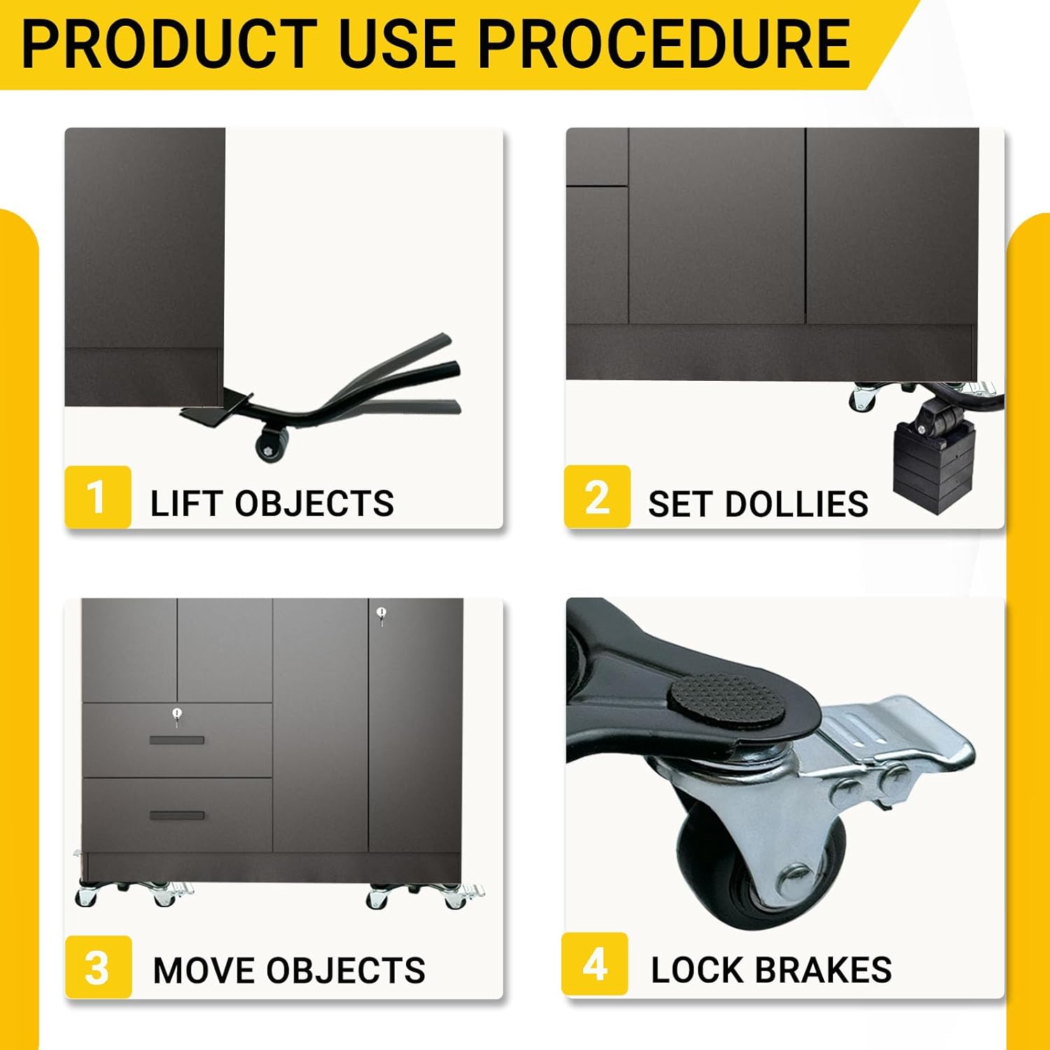 • 【Furniture Dolly Movers】Upgraded version of large panel furniture cart set, including four 6.3 x 6.3-inch Dollies with Brake, 1 Pry Bar with Lock, 4 Heightening Spacers, 4 Flannel Anti-Slip Pads, 2 EVA Anti-Slip Pads, 1 Pair of Gloves