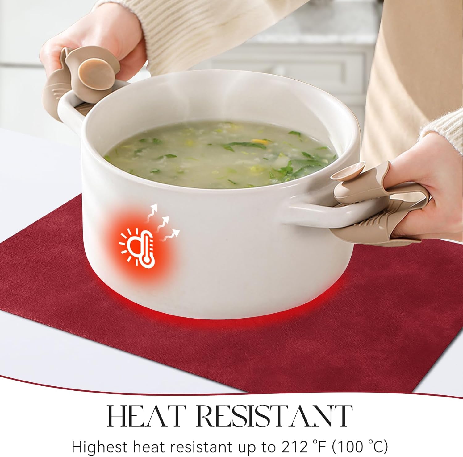 • HASSLE-FREE CLEANING: Our faux leather placemats are designed to be 100% waterproof to better protect the table from grease and grime compared to woven and fabric placemats. If the placemats get stained with sauce or food residue, simply wipe with a cloth or rinse with water.