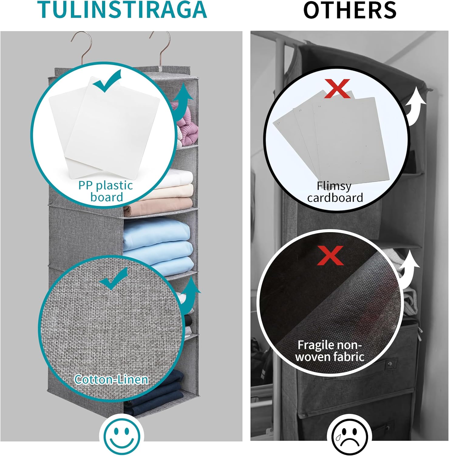 • The enlarged wardrobe hangings are made of cotton and linen fabrics, with pp plastic plates in the middle, which are strong and durable and can bear the weight of more clothes. They will not deform after washing.