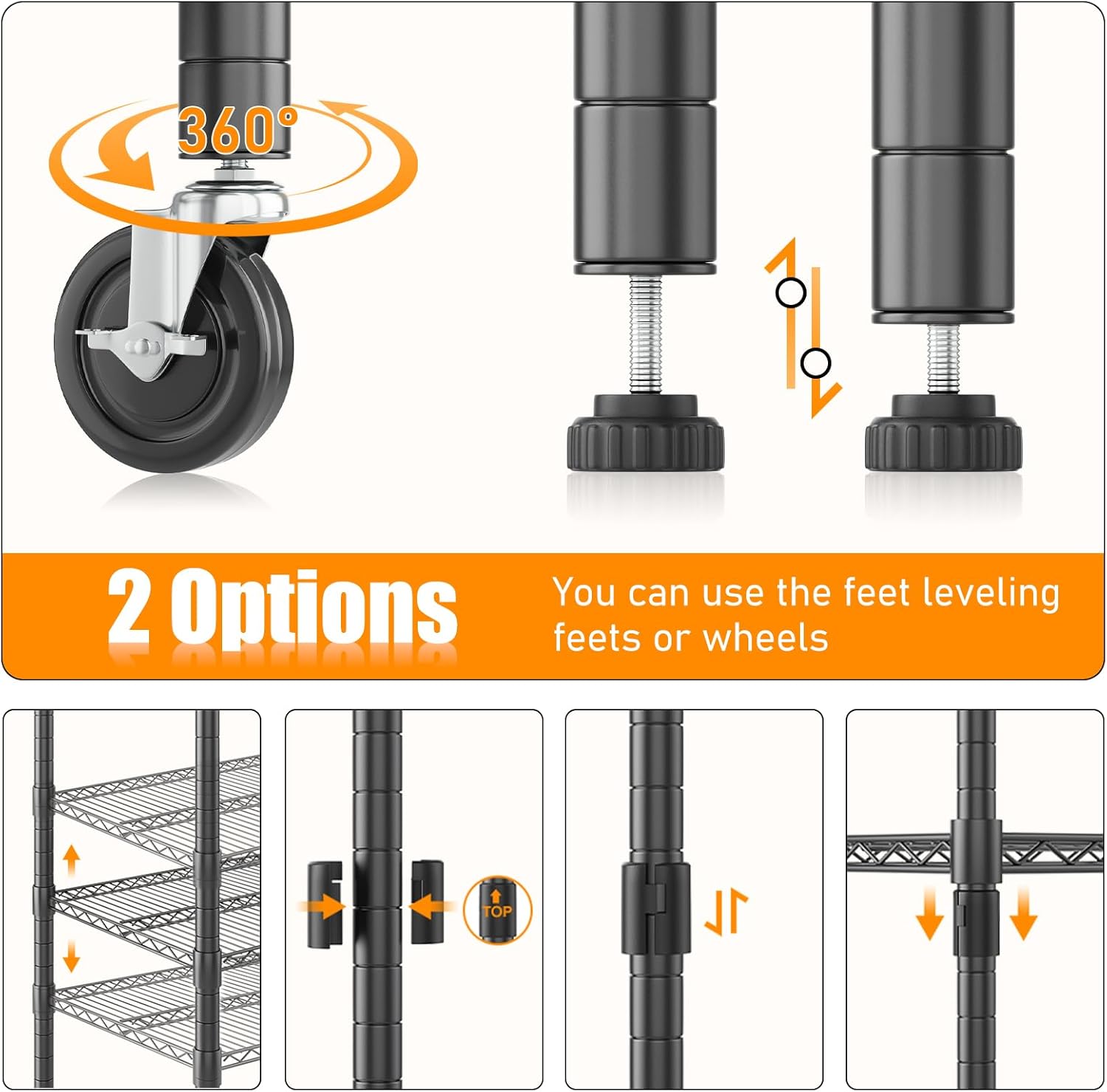 • 【ADJUSTABLE HEIGHT】Each layer of the wire shelf can be adjusted to match the height of your items, optimizing your storage space. Additionally, you can join two storage racks to form a wider unit, providing extra width to meet your needs. No matter your requirements, you can assemble a shelf configuration that fits just right