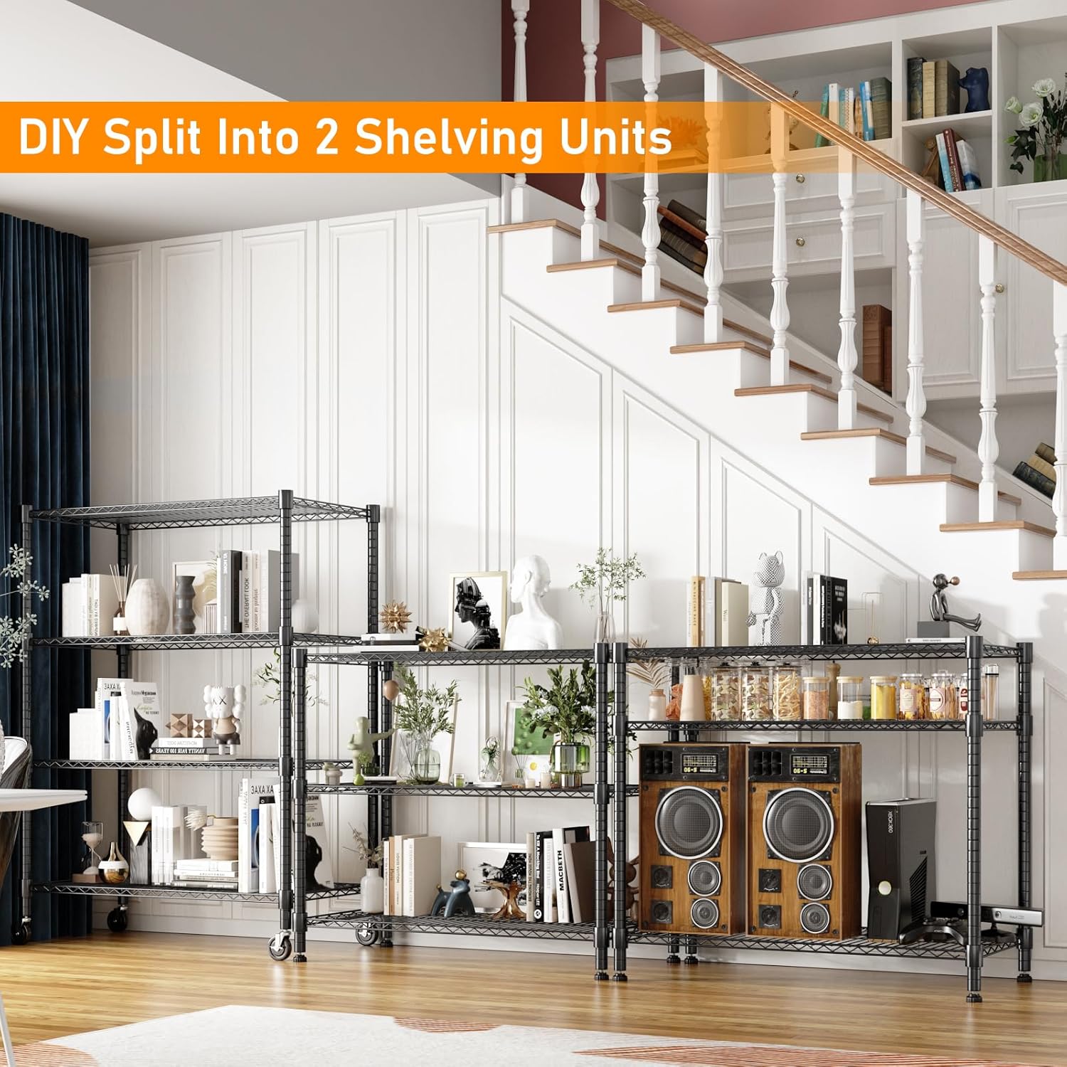 • 【LARGE SIZE】The size of wire shelf storage rack on wheels is 75"H X 36"W X 18"D (72"H on feet). This wire shelf can provide additional storage space without occupying too much space.The appropriate size makes the metal shelves for storage suitable not only for kitchens, bathrooms, storage rooms, living rooms, warehouses, basemnet, offices, commercial exhibitions, hotels, supermarkets, etc
