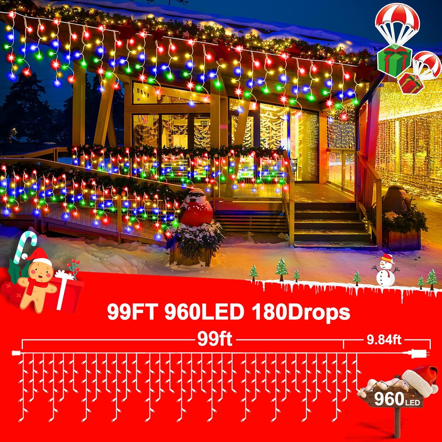 KNONEW 99ft 960 LED Christmas Lights Outdoor Decorations with 180 Drops, 8 Modes Curtain Fairy Light, Clear Wire LED String Light Indoor Decor for Wedding Party Christmas(Multicolor)
