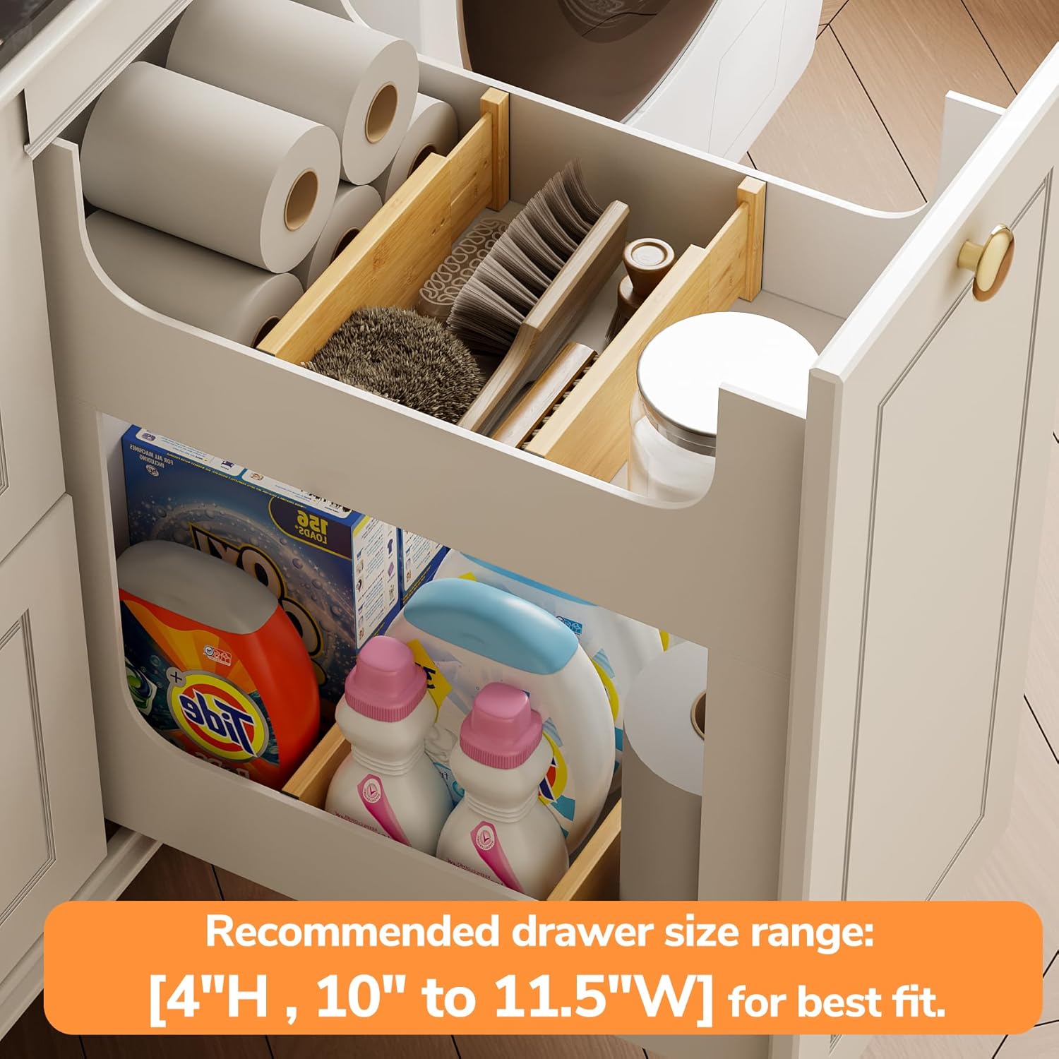 • Expandable design: Each deep drawer divider is 4" H, 0.6"W, and 10" to 12.28"L, which can be adjusted according to the size of the drawer, adapting to different furniture needs. Fits at least 4"H & 10-11.5"W drawers. Do not overstretch—may reduce elasticity if extended beyond recommended length.