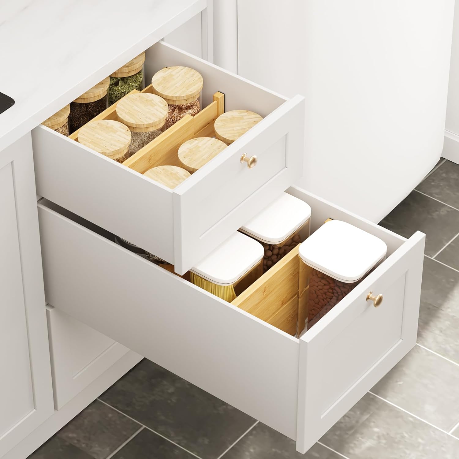 • No Need to Install: This kitchen drawer dividers have a built-in spring structure that eliminate the need for tedious installation steps; Simply push it gently and squeeze both sides inward, the pin comes off instantly and is ready for use