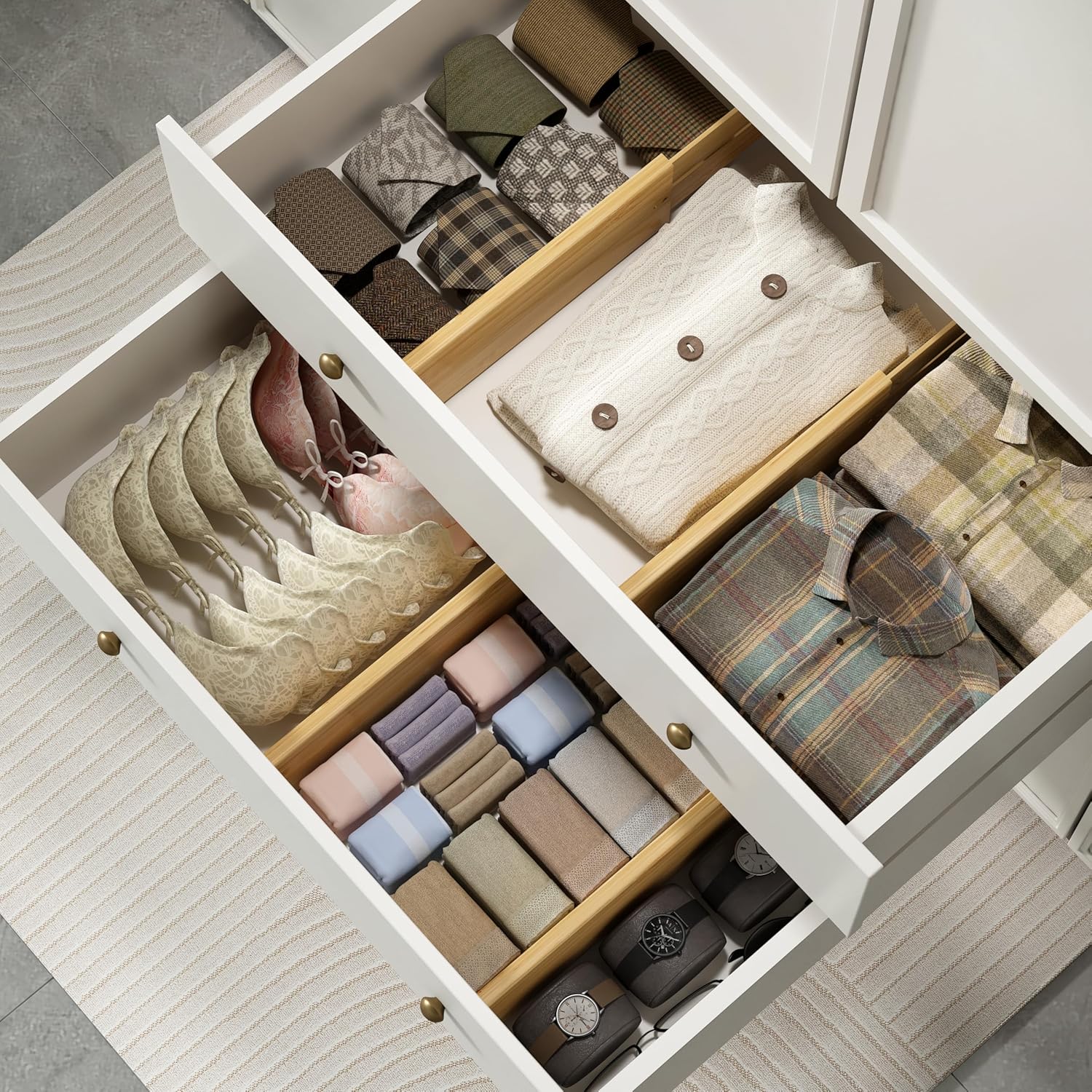 • Premium Bamboo Material: These bamboo drawer dividers are made of high quality bamboo material, natural color, tough texture, smooth surface, well made and long-lasting; Simply wipe it with a damp cloth