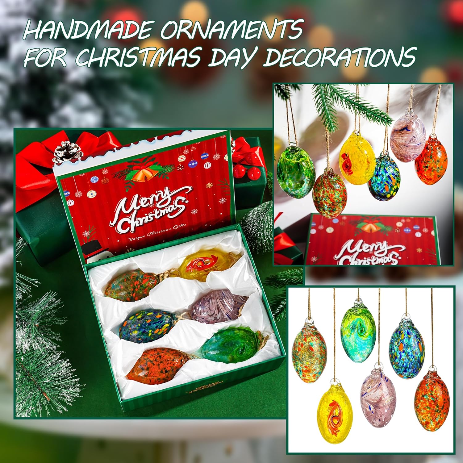 • Blown Glass Christmas Ornaments:This set of 6 glass ornaments is coming with a nice Christmas gift box.Each ornament is about 3.9(l)*2.1(W).The total weight of 6 glass egg ornaments is about 816 gram.