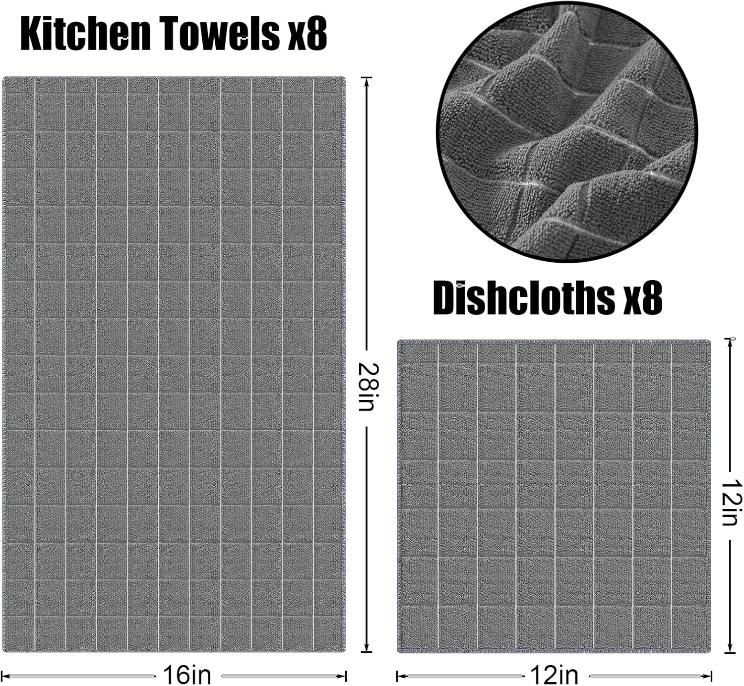Homaxy Microfiber Kitchen Towels and Dishcloths Set, 16 Pack Soft and Absorbent Dish Hand Towels Bulk, 28 x 16 Inch & 12 x 12 Inch Quick Drying Rags for Washing Dishes, Grey