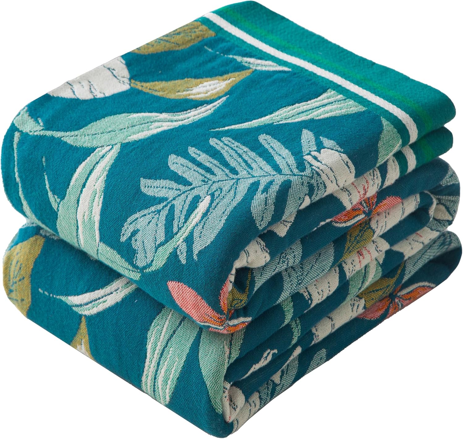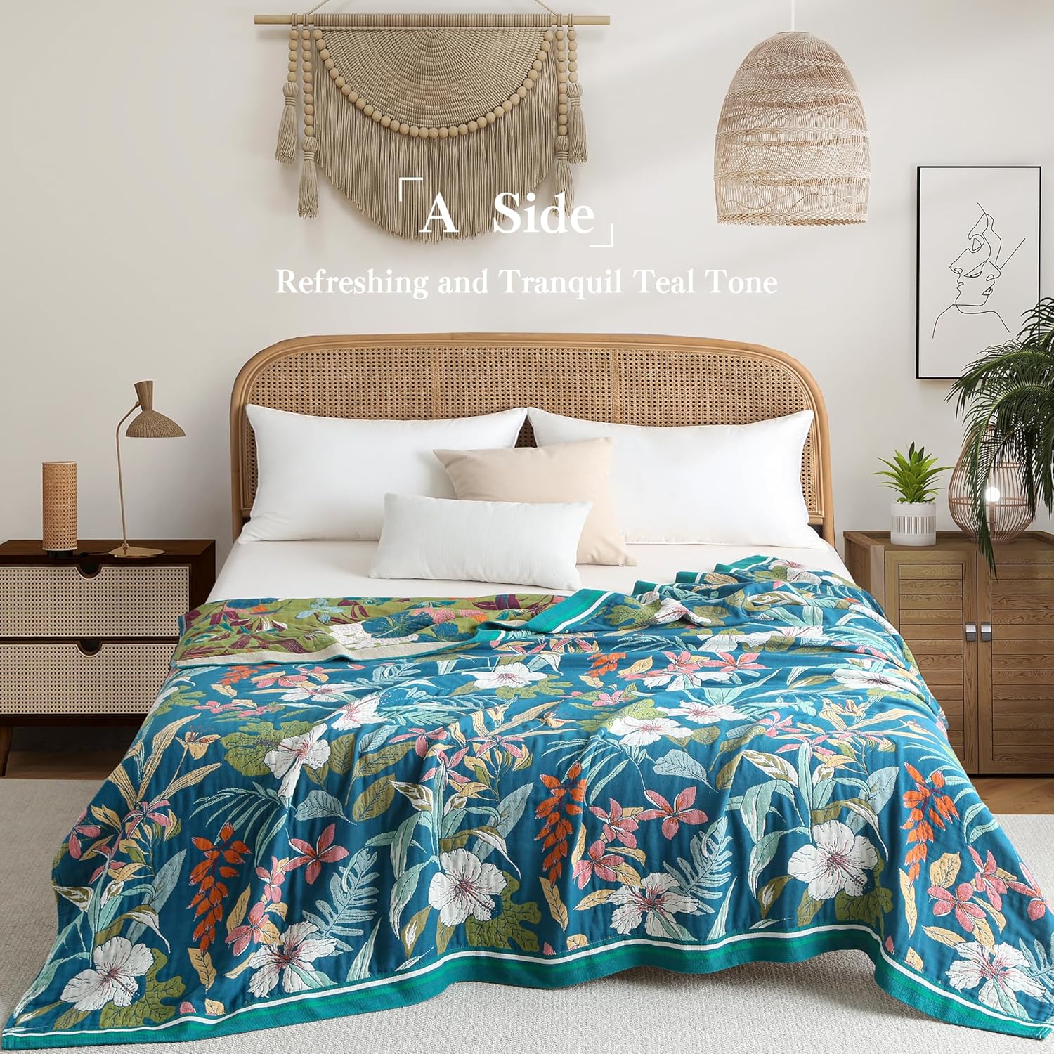 Boho Throw Blanket Twin Size, Soft Cozy Cotton Muslin Quilt Blanket for Bed Decor, Floral Patterned Couch Sofa Chair Cover, Vintage Farmhouse Cottage Tapestry Woven Blanket, Teal&Green