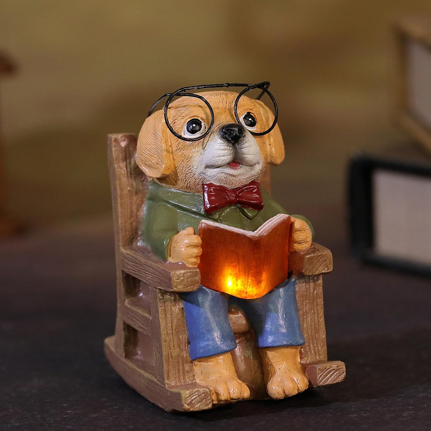 • Perfect Solar Dog Christmas Decoration - This charm dog statues outdoor solar lights, reading a book on a cozy rocking chair, cute and creative, add more warmth atmosphere to your home, win your neighbors' attention at Christmas. Christmas dog ornaments lifelike detail and relaxed pose make it a delightful addition for dog lovers and book lovers alike.