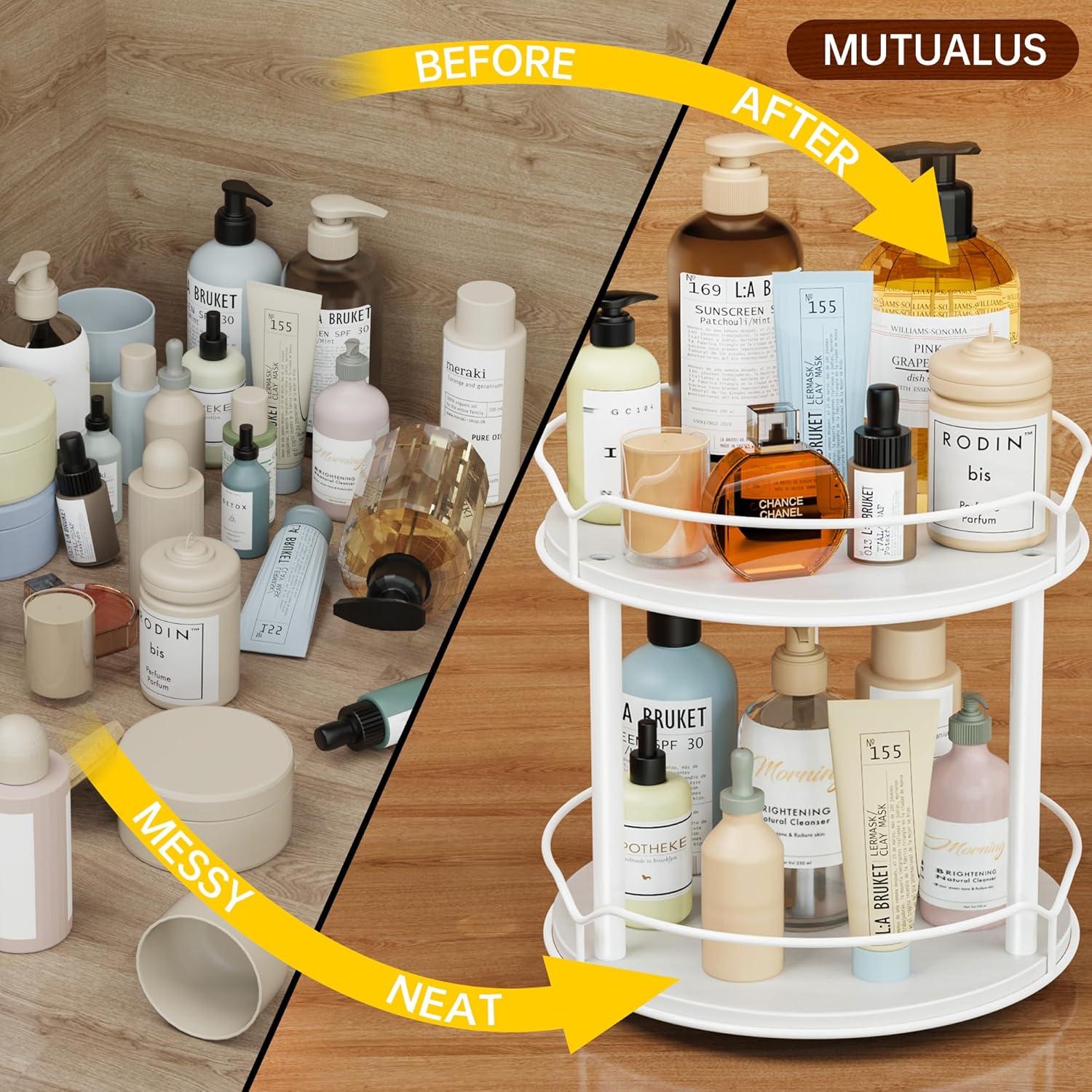 • 2. Efficient Design for Easy Access: Whether you're grabbing your favorite spices or toiletries, our Lazy Susan organizer makes it easy. The two-tier design allows for efficient storage, while the rotating design ensures easy access to all your items