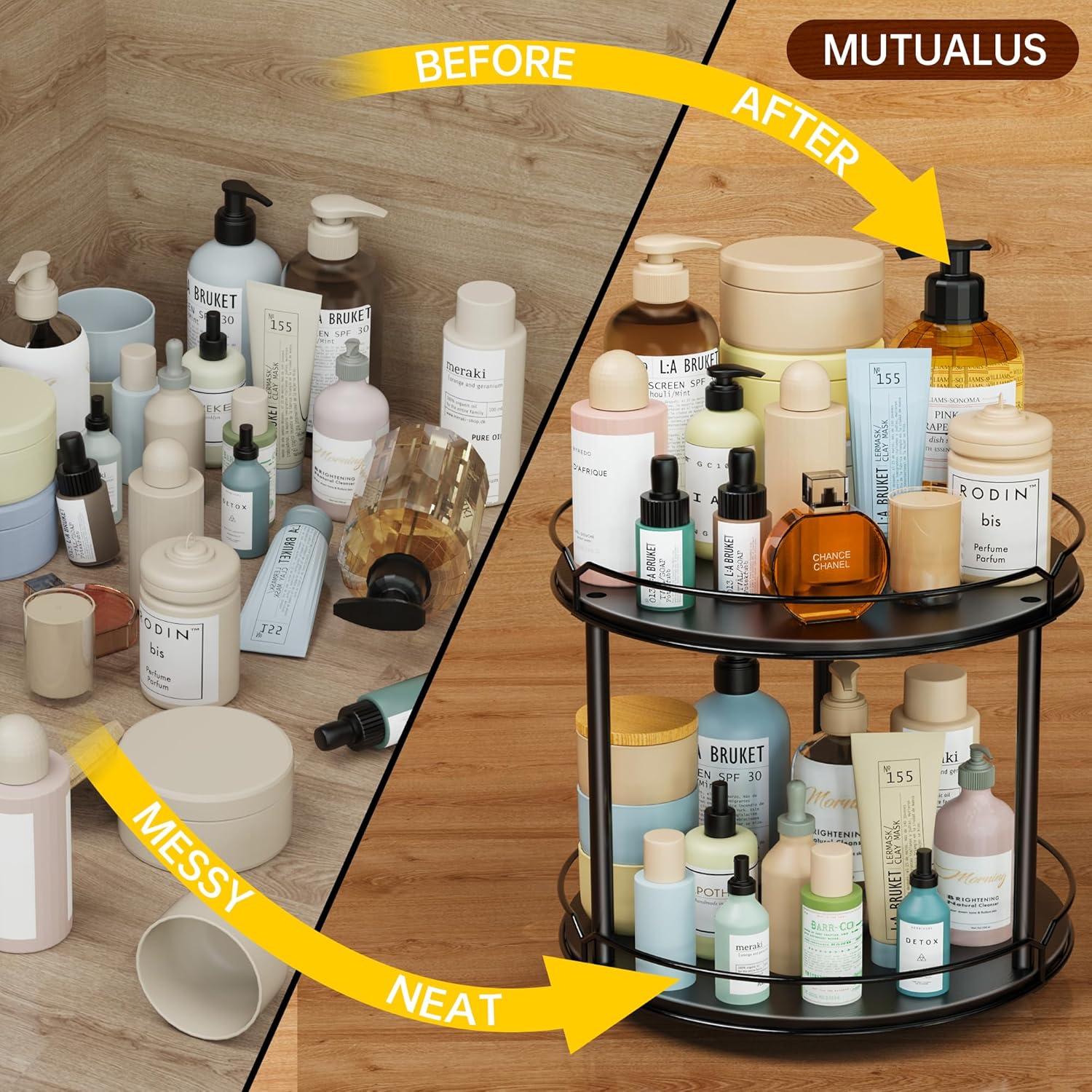 • 2. Efficient Design for Easy Access: Whether you're grabbing your favorite spices or toiletries, our Lazy Susan organizer makes it easy. The two-tier design allows for efficient storage, while the rotating design ensures easy access to all your items