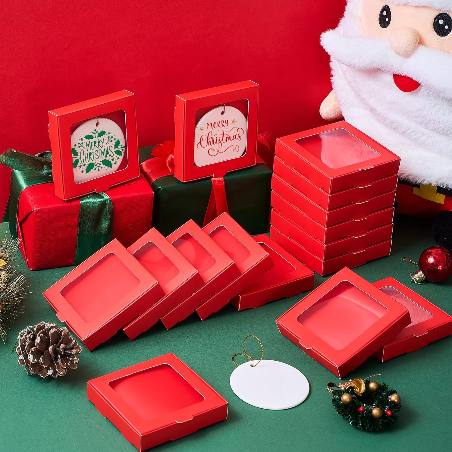 25 Pcs Sublimation Ornament Blanks Box 3.6"x3.6"x0.7" Christmas Ornaments Holder Ceramic Discs Packaging Box with Window for Personalized Xmas Tree Blanks Bulk (Red)