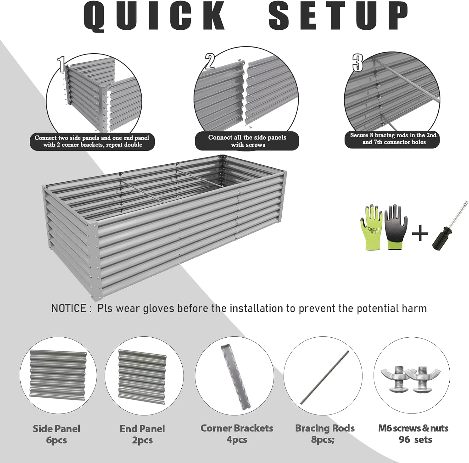 • 【Safety Features】①Anti-rust Coating, do not contaminate soil, safe for plants and humans; ②Rectangular shape, the raised planter box has no sharp corner; ③Thickened crimped edge design, no sharp edges, smooth to the touch; ④ Gloves included; will not hurt your hand when installing or planting