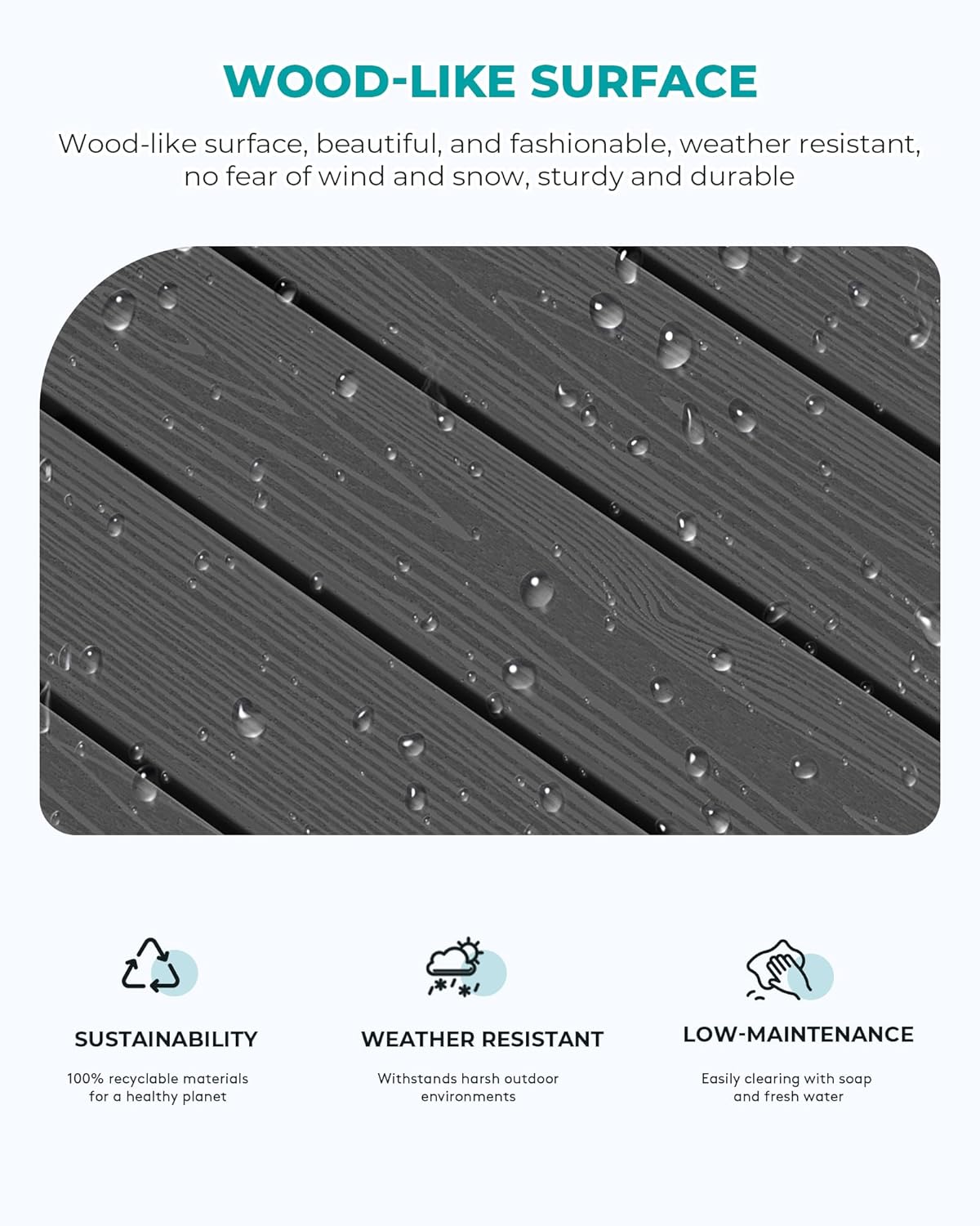 • Wood-like Texture: Offering the aesthetic appeal of wood without the upkeep, the SERWALL HDPE outdoor coffee table features a wood-textured surface that adds an elegant and natural touch to your outdoor decor. allowing you to have an outdoor experience just like real wood without the drawbacks of solid wood.
