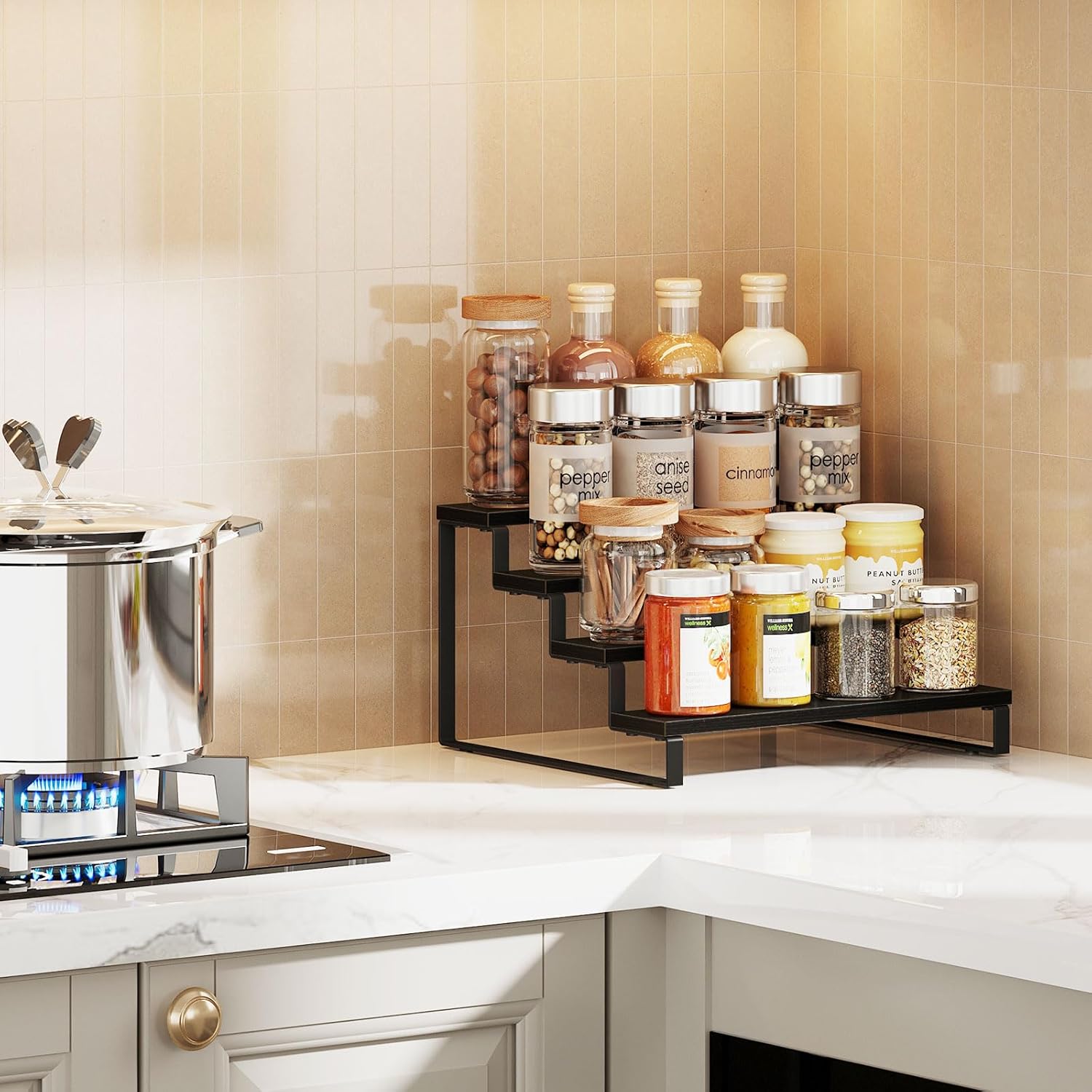 • Easy Access and Visibility: The tiered spice rack design allows for easy access and clear visibility of all your spices, so you can quickly find what you need while cooking. Say goodbye to rummaging through drawers and cupboards