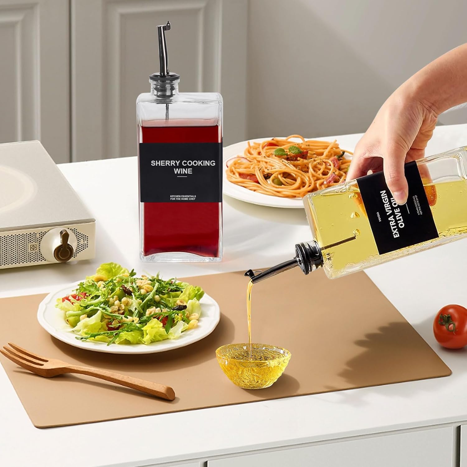 • [HIGH QUALITY & UPGRADE DESIGN] Our cooking oil container is made of superior quality BPA-FREE glass, combining a shatterproof body with a 304 stainless steel spout, rustproof and lightweight, ensuring controlled liquid flow, and preventing any spillage and leakages from staining your countertop. Moreover, each pouring spout has a seal ring, and the cap is fully closed when not in use, keeping your liquid ingredients fresh and original