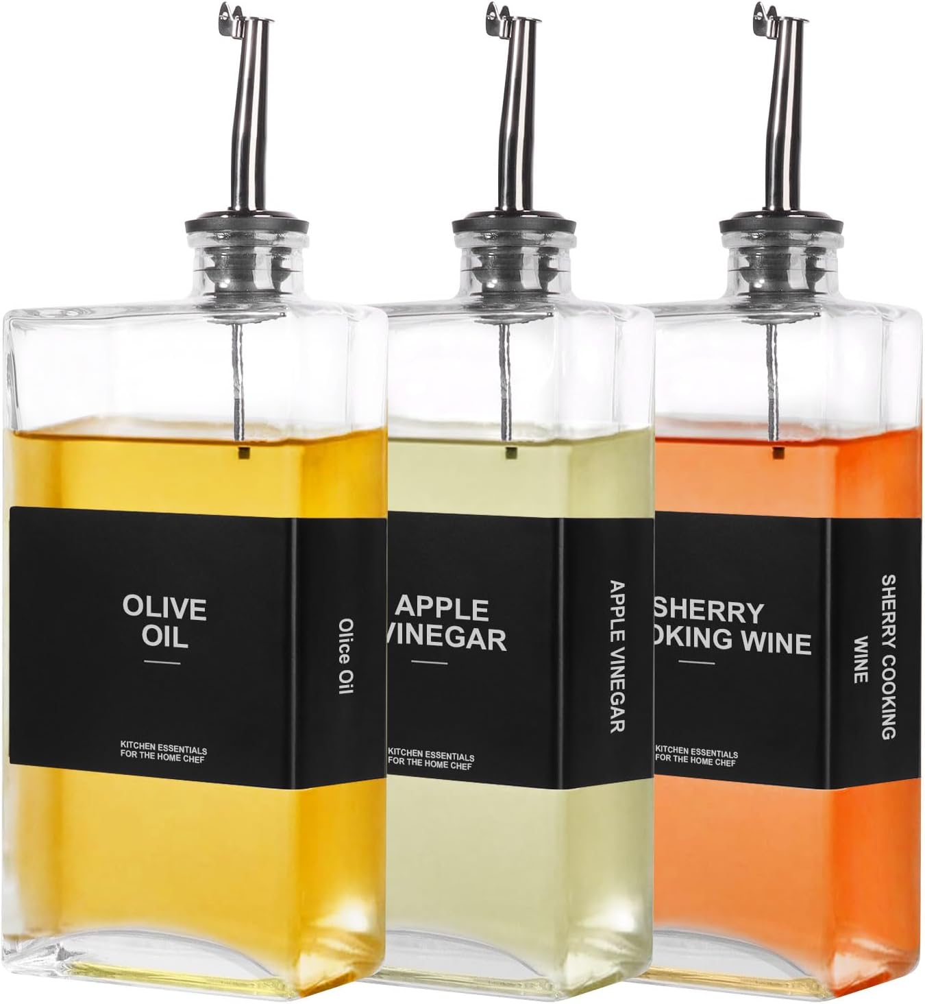 • [VERSATILE OIL DISPENSER SET] OKYUK Oil dispenser set comes with 3 * glass oil bottles, 3 * drip-free oil spouts, 1 * silicone funnel, and 40 * labels. These oil dispensers are suitable to use for your kitchen, and they are also practical for holding or dispensing oil, vinegar, soy sauce, cooking wine, or mouthwash. This 3pcs oil dispenser bottle set meets most of your daily needs and is perfect to share with your lover, family, and friends