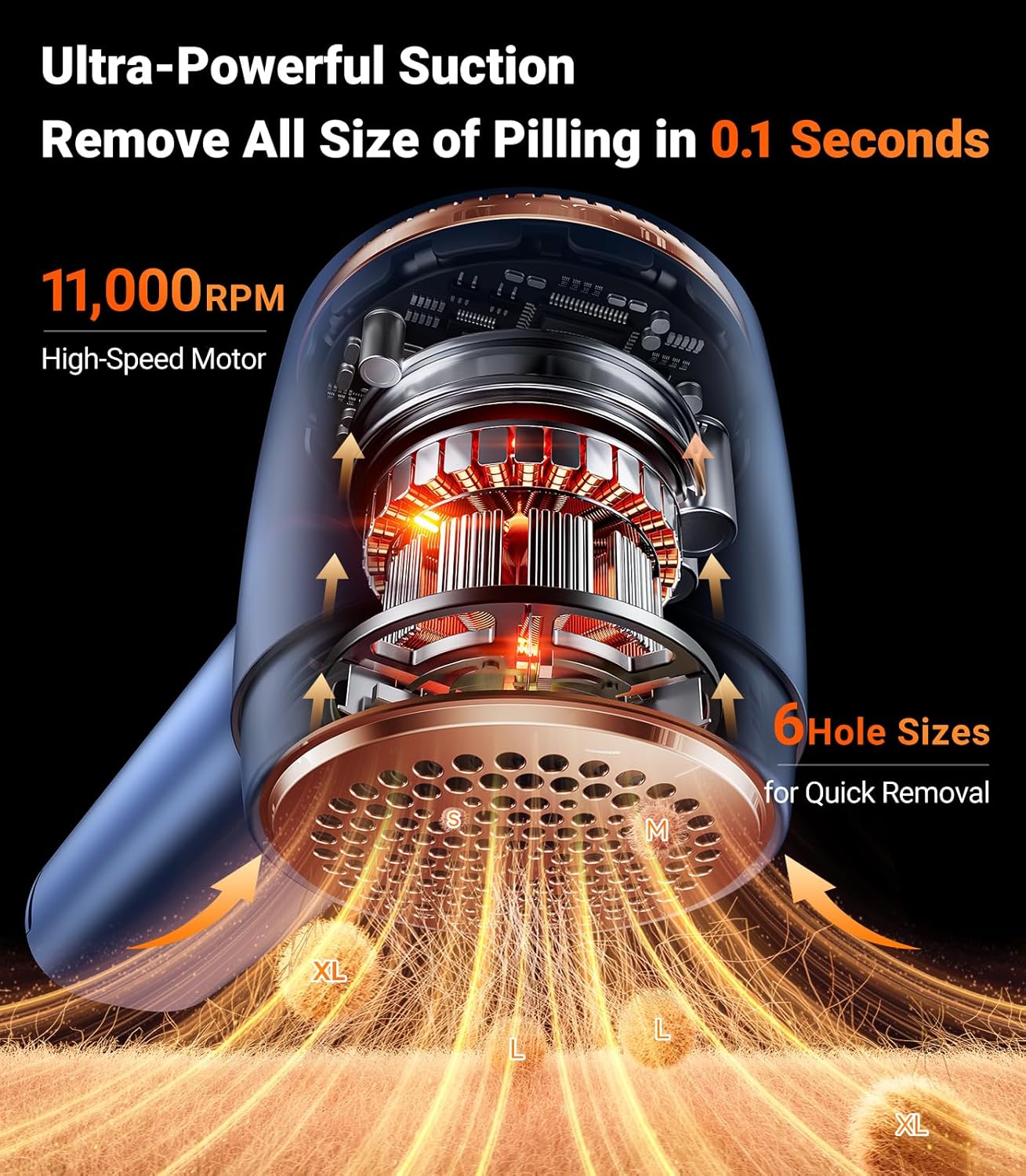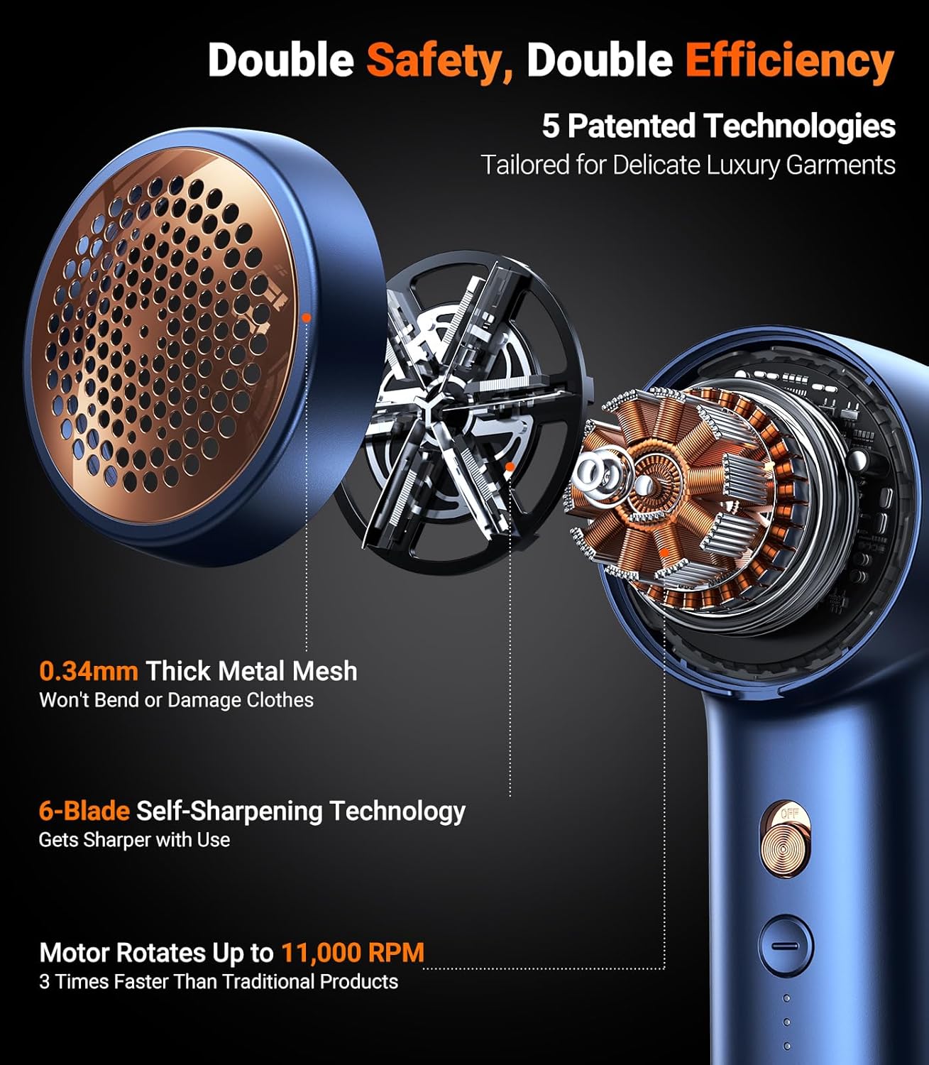 • [Triple Safety Protections] Protect your luxury clothing with triple safety protection mode. Once you open the net cover and lint container, the lint shaver rechargeable will automatically cut off the power to ensure the fabric's good condition and your safety. The electric lint remover for clothes maintains a safe distance between fabric and blades with the suck-shave technology, preventing clothing damage. Revitalize the fabrics in your cozy home with a brand new freshness.