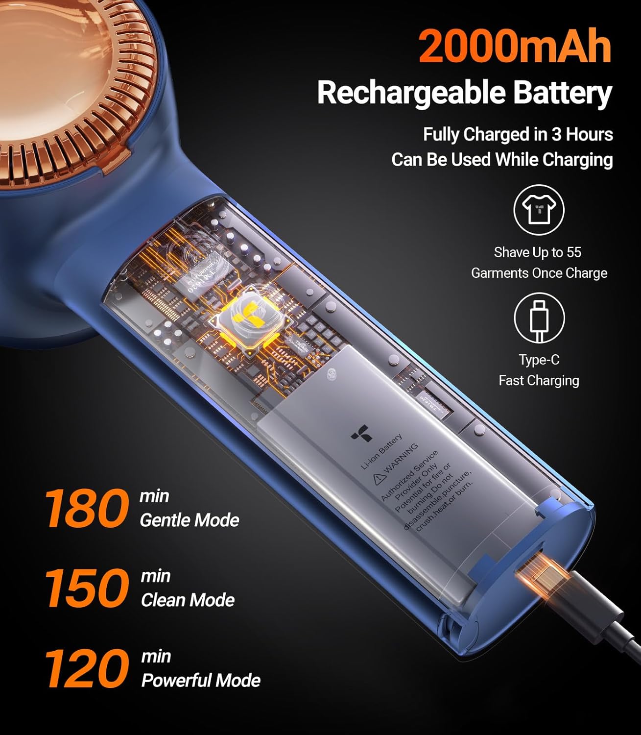 • [Wireless Use & Use while Charging] 2H charging can support 5H of use. One full charge of this electric clothes shaver can clean 50 pieces of clothes. You can also use this pilling remover for clothes while charging. Whenever you need it, it can always be ready for use.