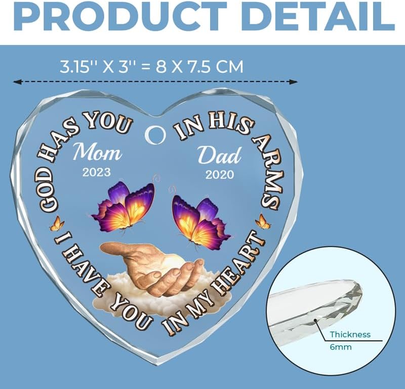 • ๐ŸŽ Memorial Christmas Ornament: The ornament is crafted from 100% clear glass with beveled edges, measuring 3.15x3 in (8x7.5 cm) in size and 6mm in thickness. It features a one-sided design. You can choose what is printed on these personalized Christmas ornaments! This ornament will be the best Christmas gift for your family members, memorial gifts for loss of loved one, gifts for grieving friends, thanksgiving ornaments for tree.