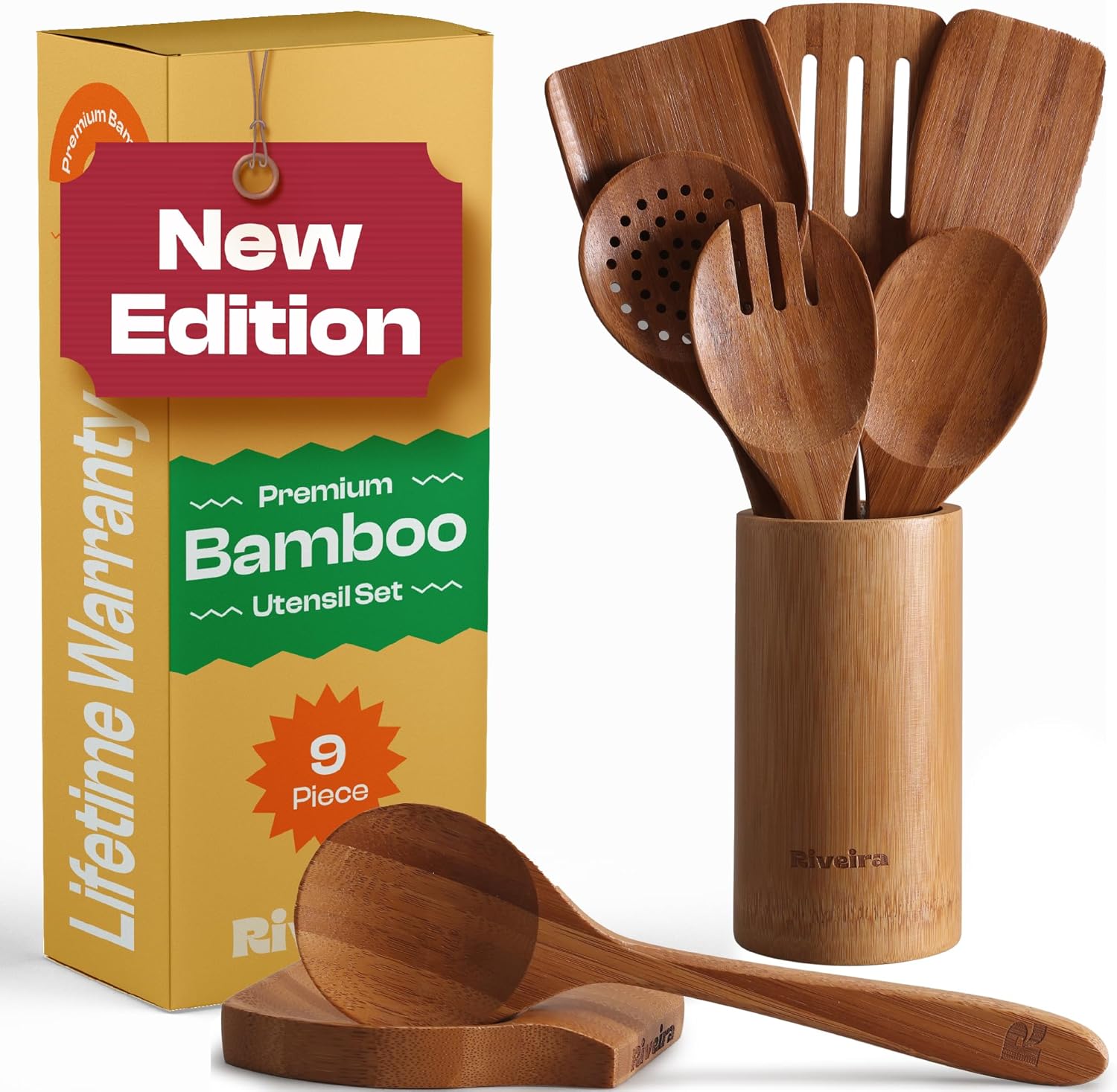 Riveira Natural Bamboo Wooden Cooking Utensils Set of 9 Premium Quality Non-Toxic Wooden Spoons and Spatulas for Cooking