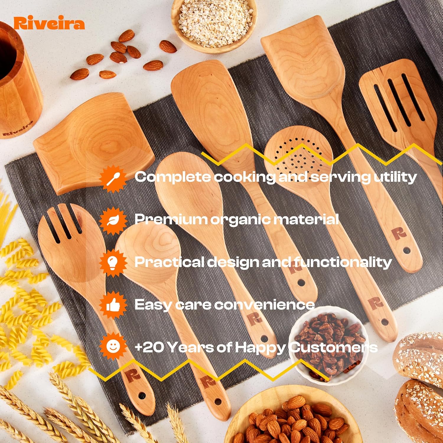 Riveira Cherry Wooden Spoons for Cooking Set of 9 – Natural Cherry Wooden Cooking Utensils, Wooden Spatula, Wooden Spoon - Premium Quality Wooden Utensil Set for Non-Toxic Cooking