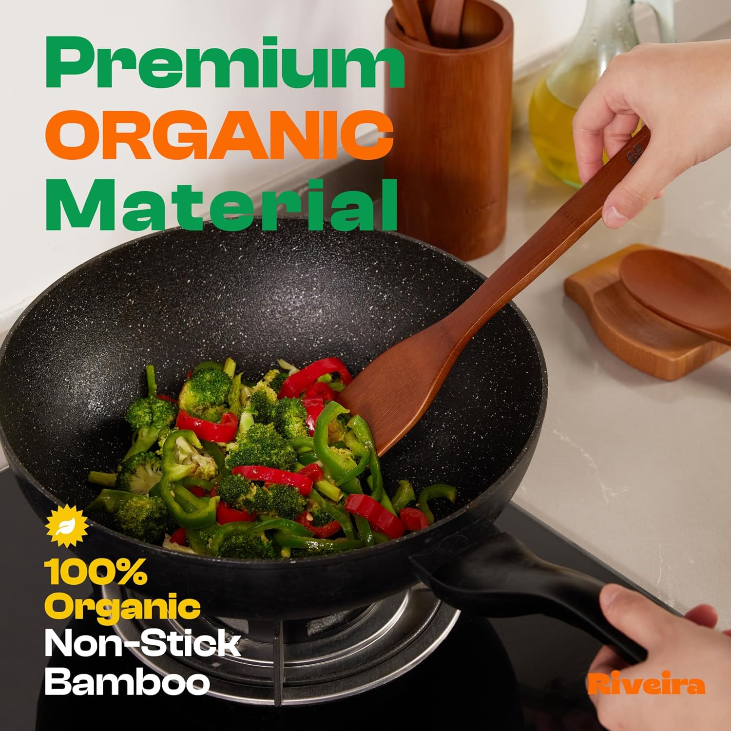 Riveira Premium Brown Bamboo Wooden Spoons for Cooking Set of 3 – Premium Brown Bamboo Wooden Cooking Utensils, Wooden Spatula, Wooden Spoon - Premium Quality Wooden Utensil Set for Non-Toxic Cooking